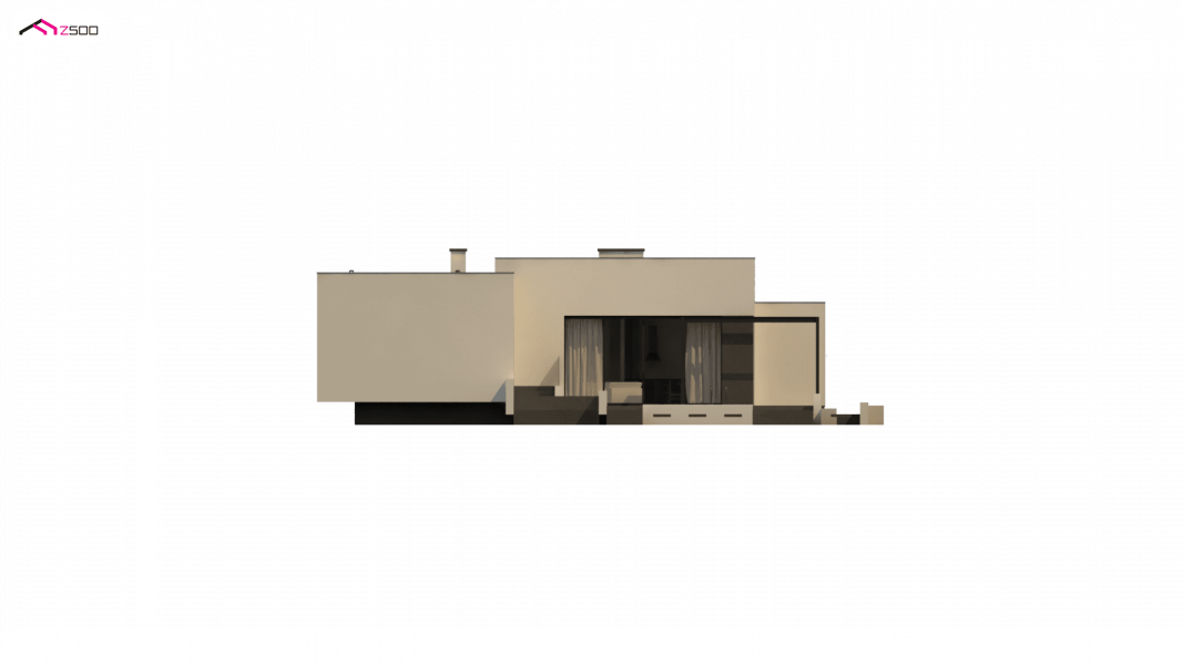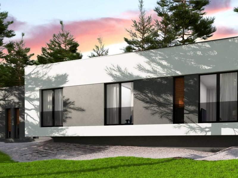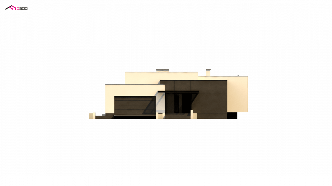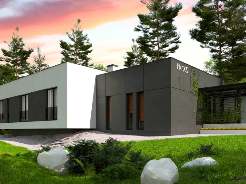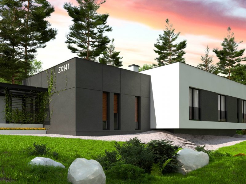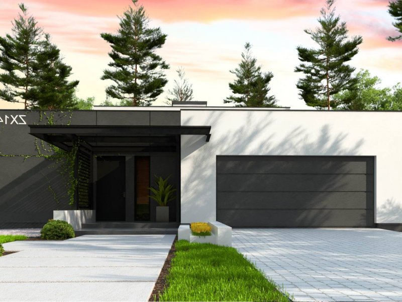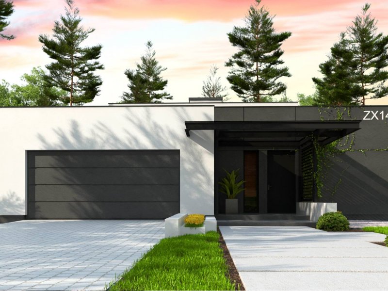 Zx141 to dom parterowy z płaskim dachem wielospadowym i dwustanowiskowym garażem charakteryzujący się wizualnym aspektem nowoczesności. Biel i czerń oraz sypialnia wznosząca się ponad inne pomieszczenia dodają mu animuszu i elegancji. Szklane balustrady i portfenetrowe okna krystalizują jego unikalny styl.