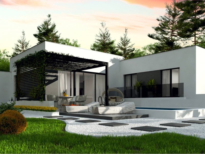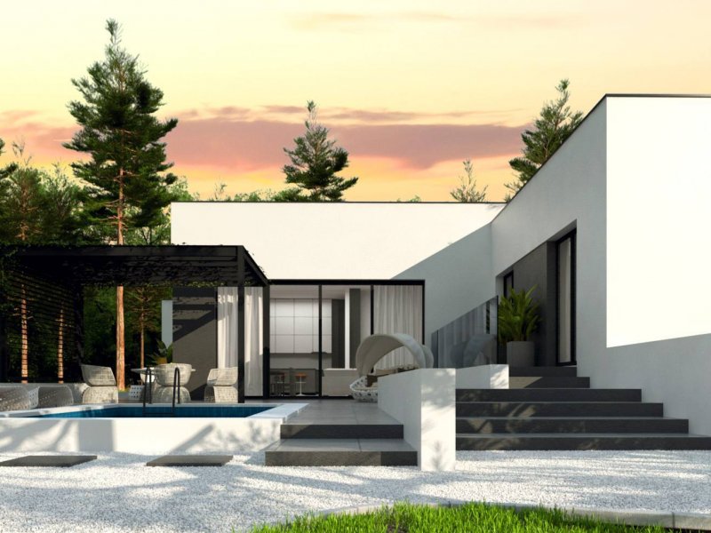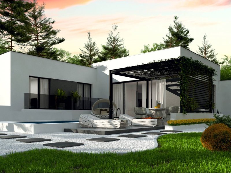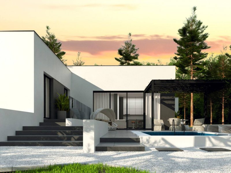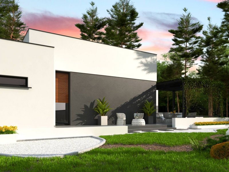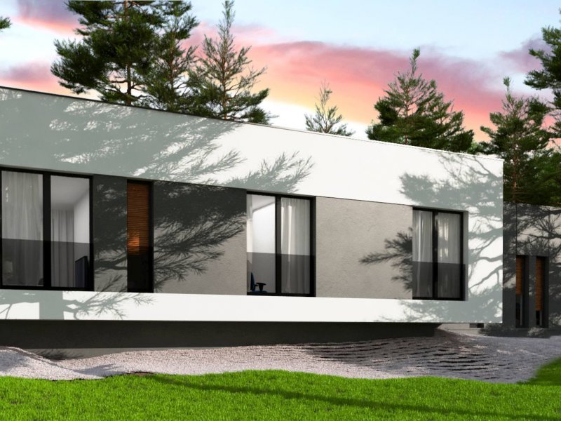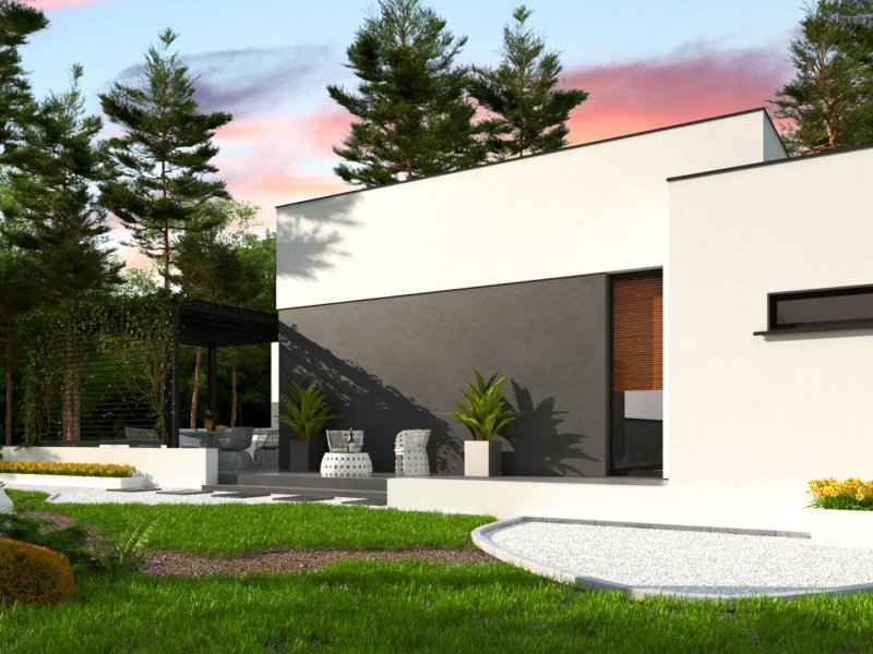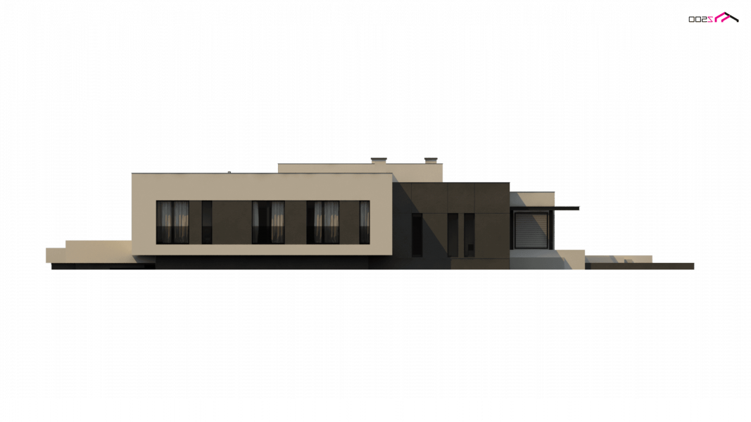 Zx141 to dom parterowy z płaskim dachem wielospadowym i dwustanowiskowym garażem charakteryzujący się wizualnym aspektem nowoczesności. Biel i czerń oraz sypialnia wznosząca się ponad inne pomieszczenia dodają mu animuszu i elegancji. Szklane balustrady i portfenetrowe okna krystalizują jego unikalny styl.