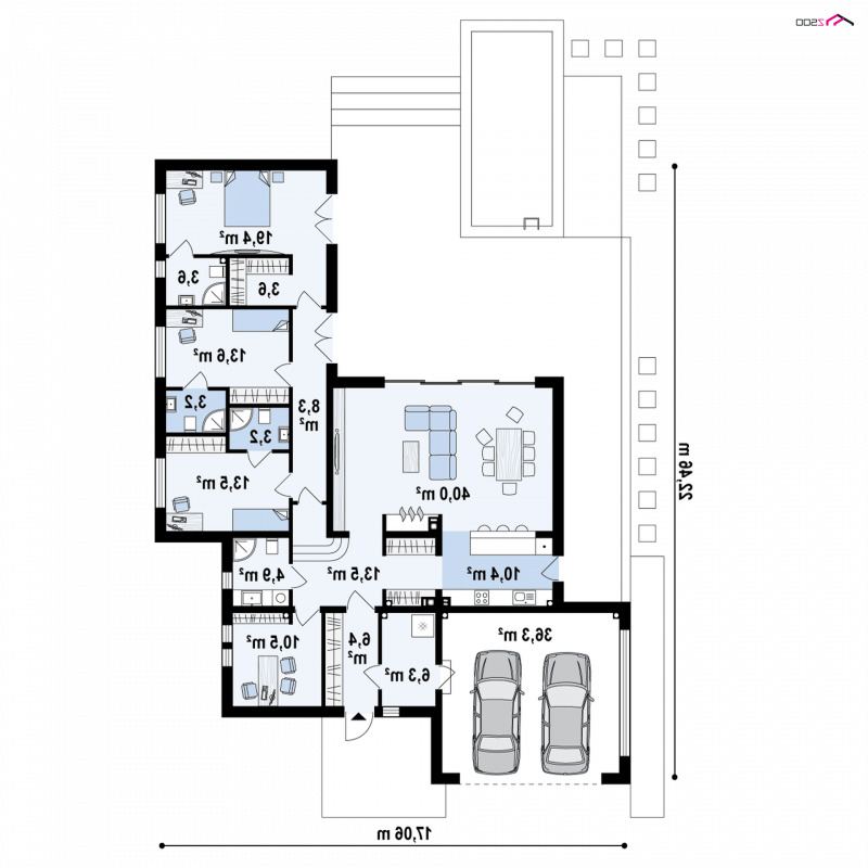Prawa część domu to nasze prywatne królestwo. Nie każdy ma do niej wstęp. Trzy sypialnie, z których wszystkie posiadają wyjścia na taras, stanowią nasz cichy azyl. Z sypialni rodziców dwa wyjścia prowadzą na taras. Basen i założenie ogrodowe stanowią kompatybilną całość dla komfortu naszego wypoczynku. Akcentami architektonicznymi są głównie ciemniejsze fragmenty – od frontu kubik z wejściem głównym podkreślony podcieniem o stalowej konstrukcji, zaś od strony ogrodu pergola podkreślająca strefę wypoczynkową. Czwarty pokój od frontu może być pokojem gościnnym dla odwiedzającej nas rodziny, lub gabinetem pracy jednego z małżonków.