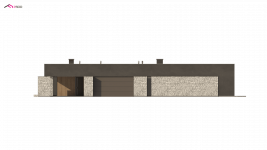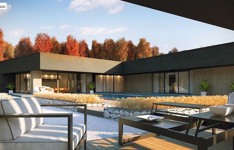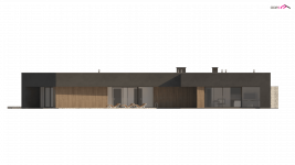 Zx142 to parterowa propozycja nowoczesnego domu w kształcie litery „L”, z płaskim dachem, dużymi przeszkleniami oraz trzema miejscami parkingowymi.