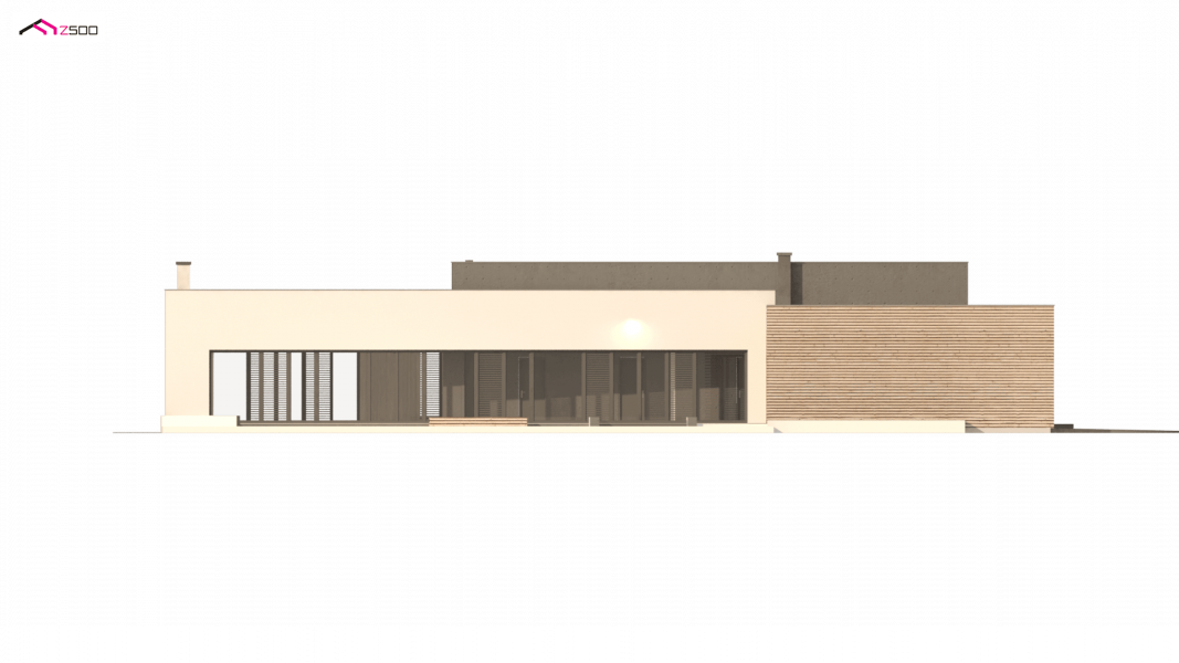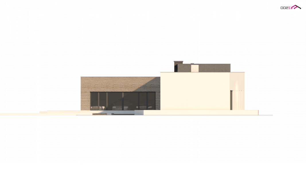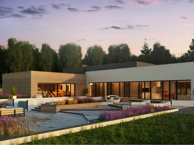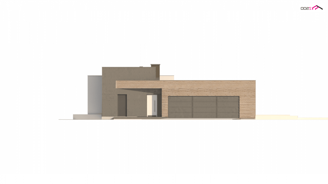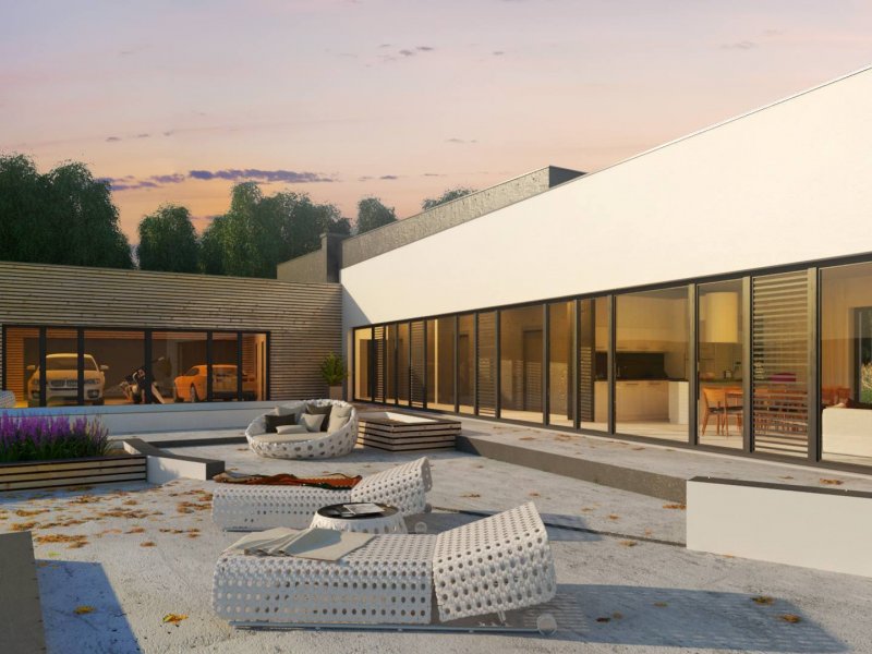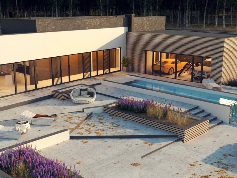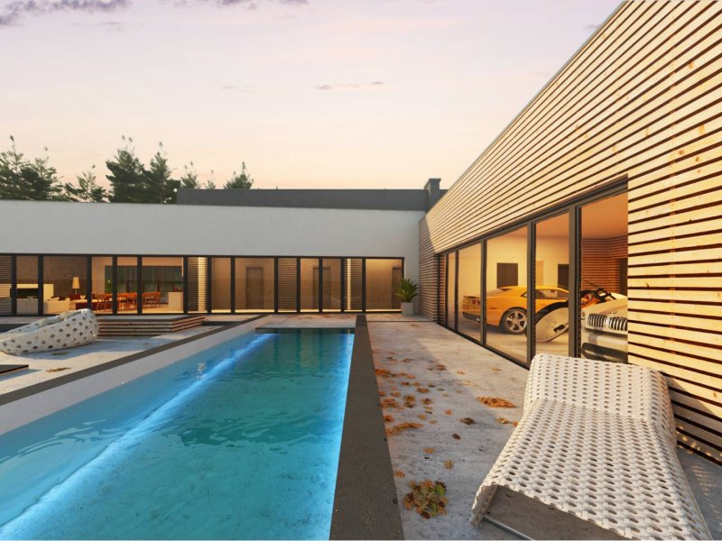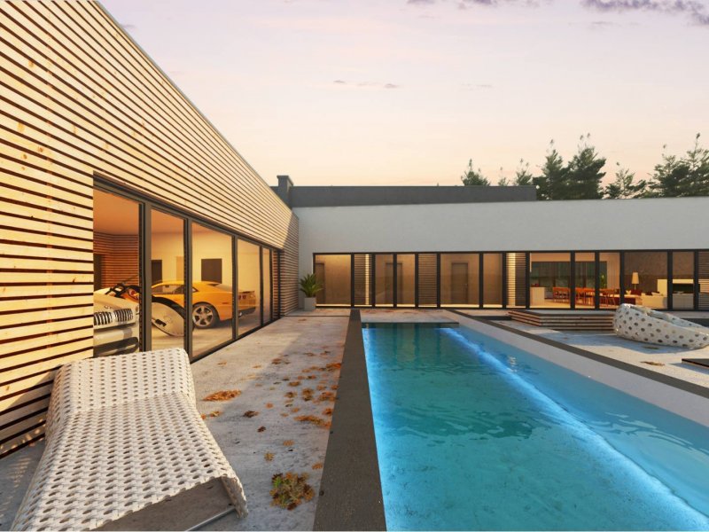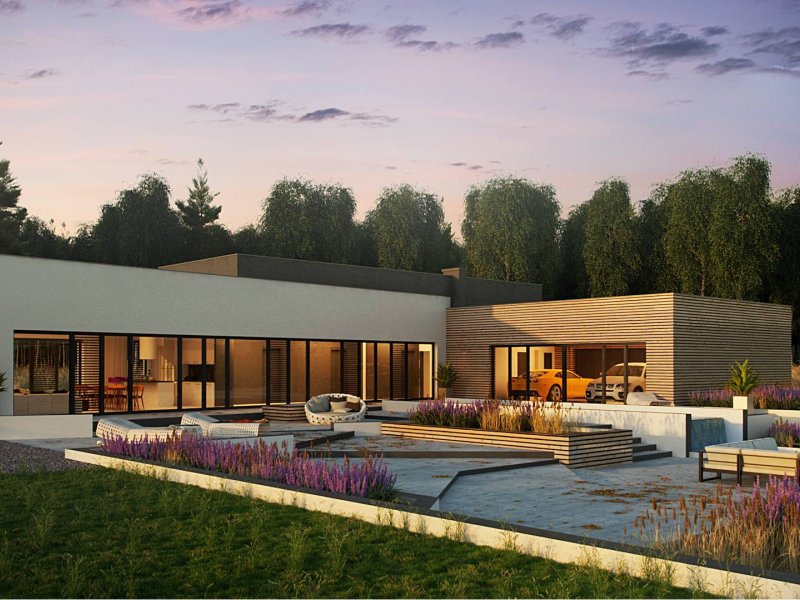 Nowoczesny autorodzinny dom w kształcie litery L, z płaskim dachem, dużymi przeszkleniami i trzystanowiskowym garażem przeszklonym od strony ogrodu. Elewację zdobioną białym tynkiem uświetnia połączenie dużych przeszkleń z drewnianymi panelami. Dwupoziomowy basen stanowi dopełnienie najwyższej jakości gustu i dobrego smaku. Możemy spędzać przy nim czas w ciepłe, letnie dni.