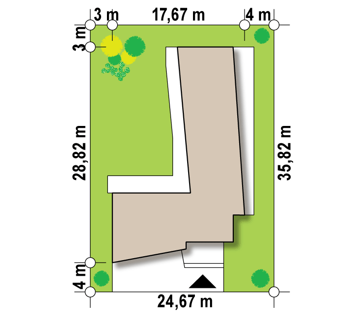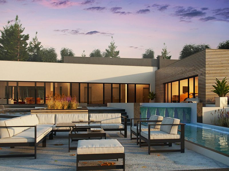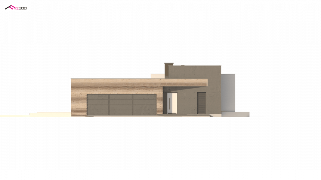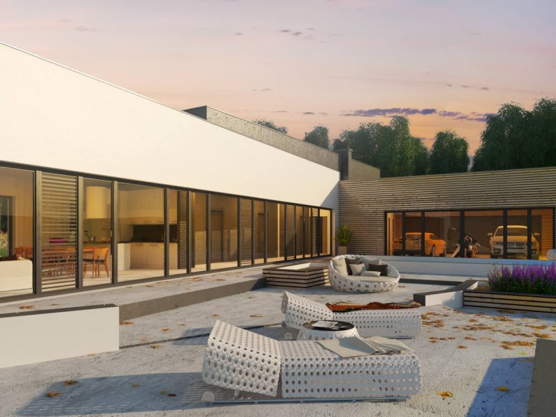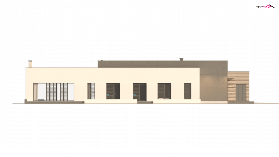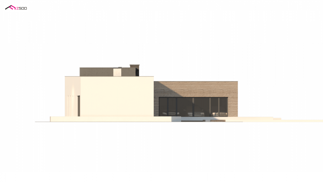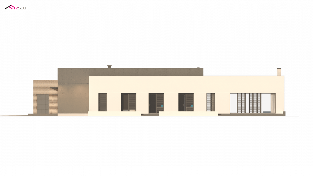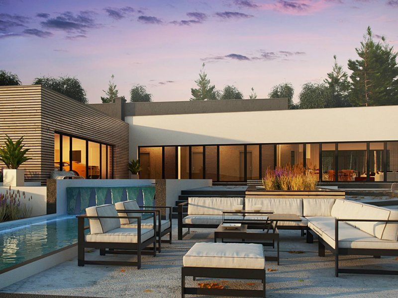 Nowoczesny autorodzinny dom w kształcie litery L, z płaskim dachem, dużymi przeszkleniami i trzystanowiskowym garażem przeszklonym od strony ogrodu. Elewację zdobioną białym tynkiem uświetnia połączenie dużych przeszkleń z drewnianymi panelami. Dwupoziomowy basen stanowi dopełnienie najwyższej jakości gustu i dobrego smaku. Możemy spędzać przy nim czas w ciepłe, letnie dni.
