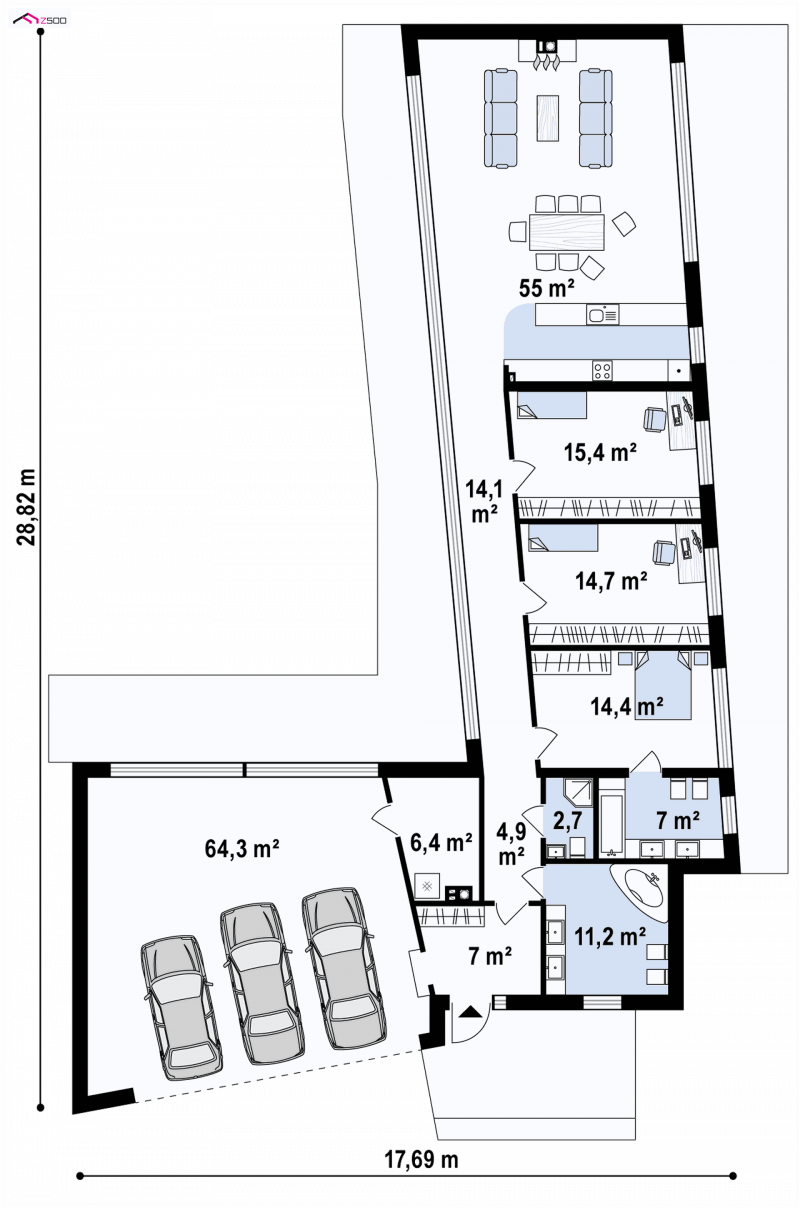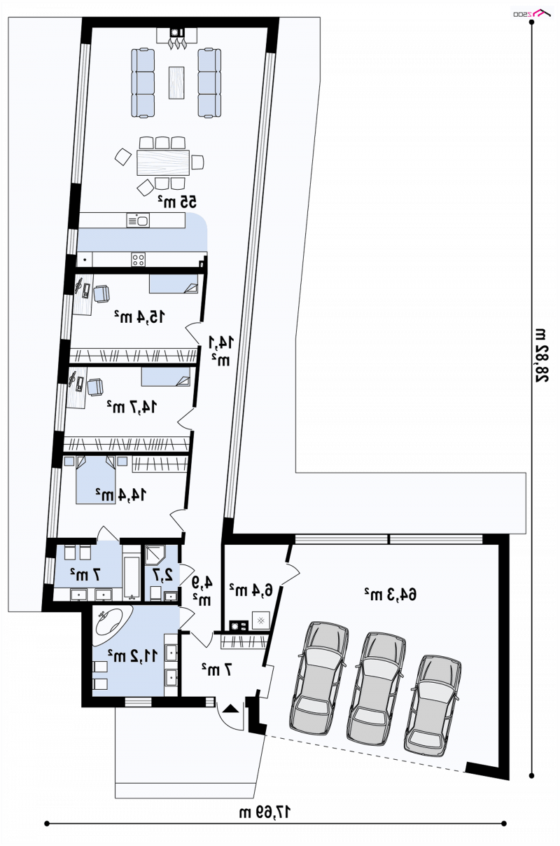 Frontowe wejście zostało zadaszone i prowadzi do sieni, która jest ogniwem łączącym garaż z pomieszczeniem gospodarczym oraz resztą domu. Przeszklony korytarz prowadzi do widnego salonu z gustowną jadalnią. Dzięki szklanym ścianom mamy widok na ogród, więc będziemy się czuć w salonie niczym na świeżym powietrzu. Kominkiem cieszyć się będą wszyscy domownicy, szczególnie w chłodne dni zimowych miesięcy, a wyspę kuchenną doceni każda pani domu. Odprężenie, to jedna z największych zalet dedykowanego Państwu projektu.