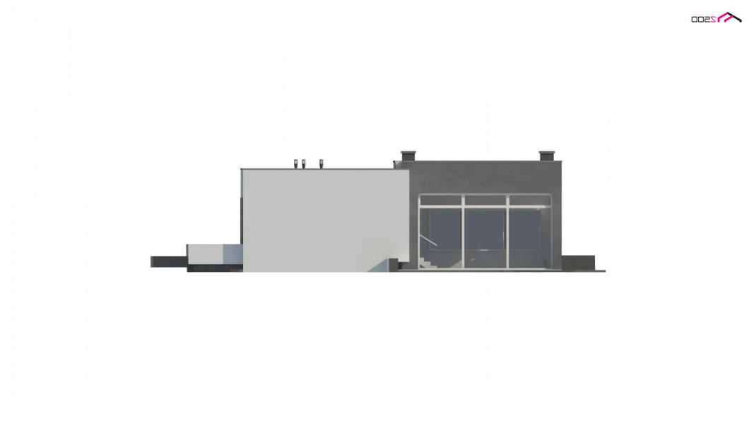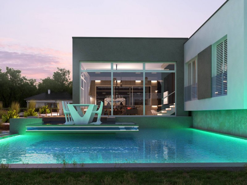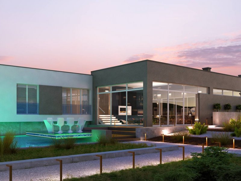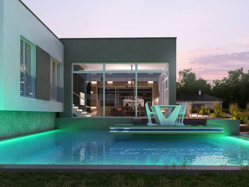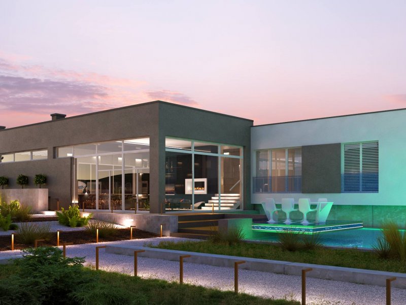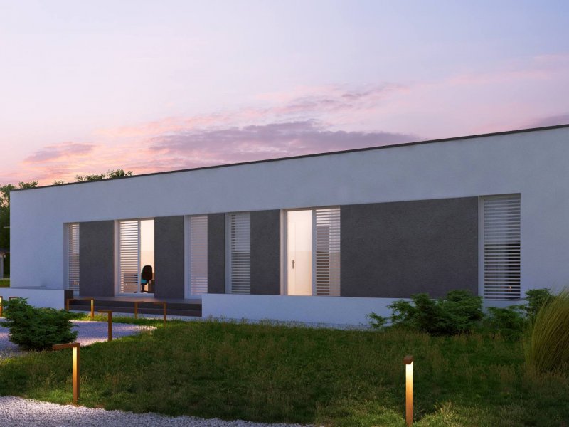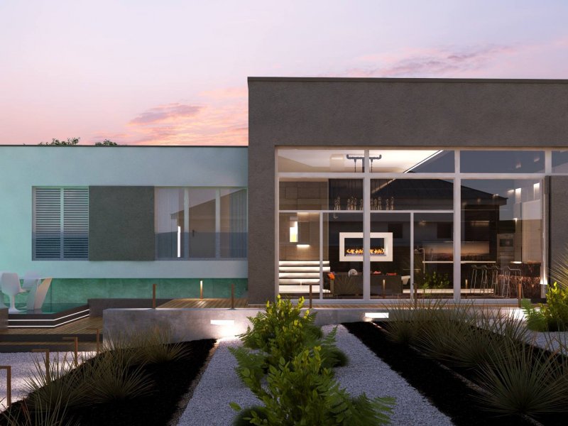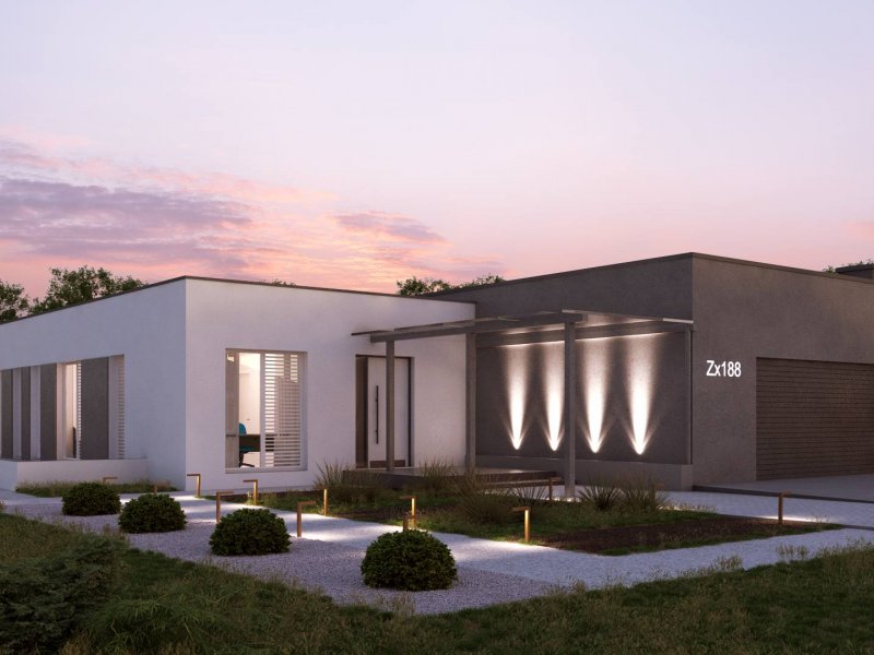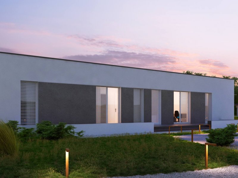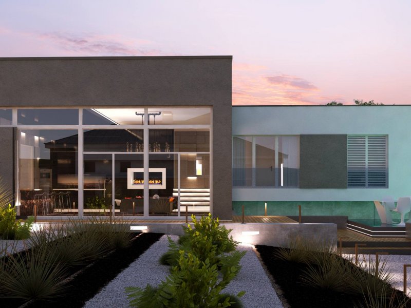 Propozycja częściowo podpiwniczonego, nowoczesnego, parterowego domu z płaskim dachem, dużymi przeszkleniami i basenem w części ogrodowej.