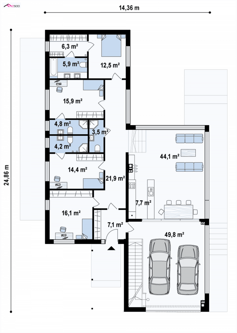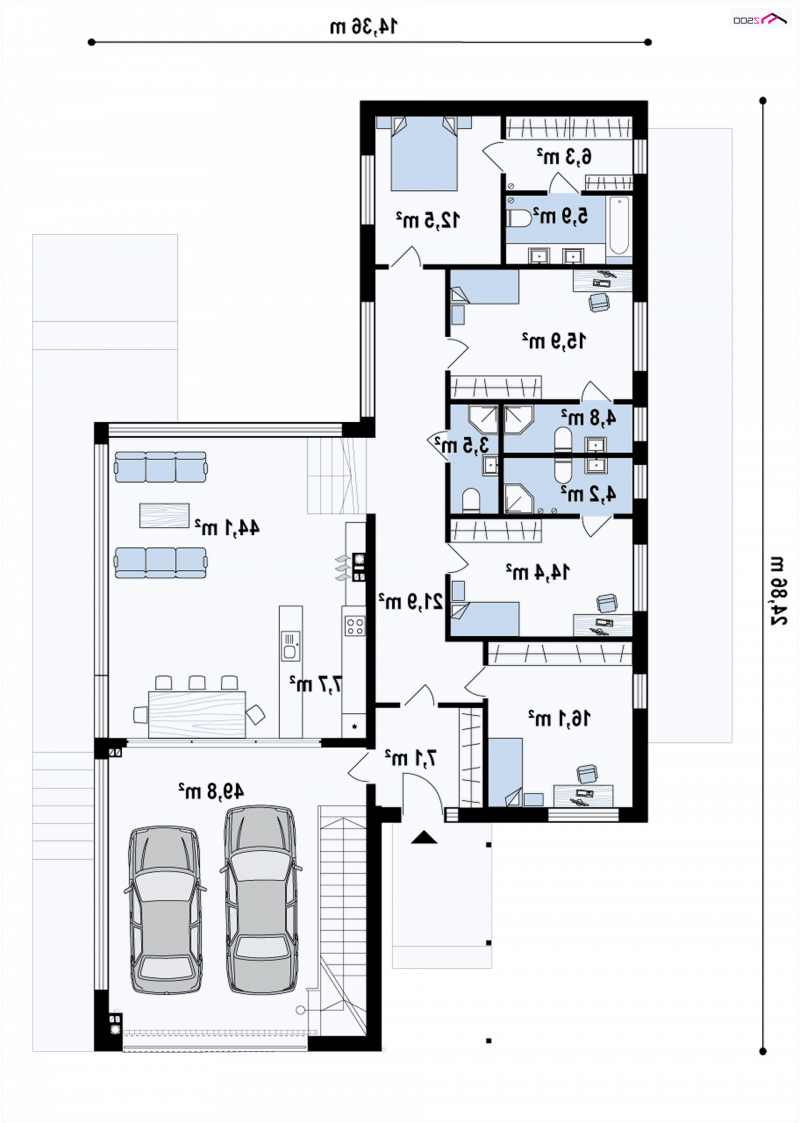 Unikalność w dedykowanym projekcie stanowi przeszklony od strony salonu garaż, dzięki czemu każdy kolekcjoner będzie mógł podziwiać swoje cudeńka z wnętrza domu, przy czym bezpośredni dostęp do garażu zabezpieczono przeszkleniami, aby woń „oleju eterycznego” i benzyny nie przenikały do wnętrza domu.