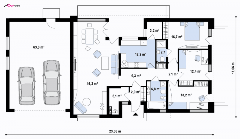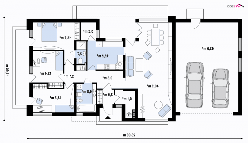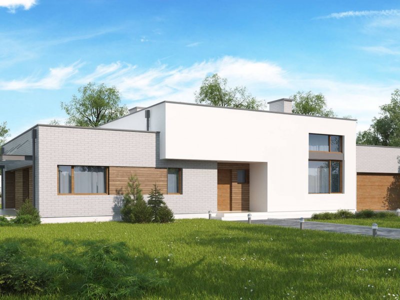Wariant z garażem dwu-stanowiskowym po lewej stronie.