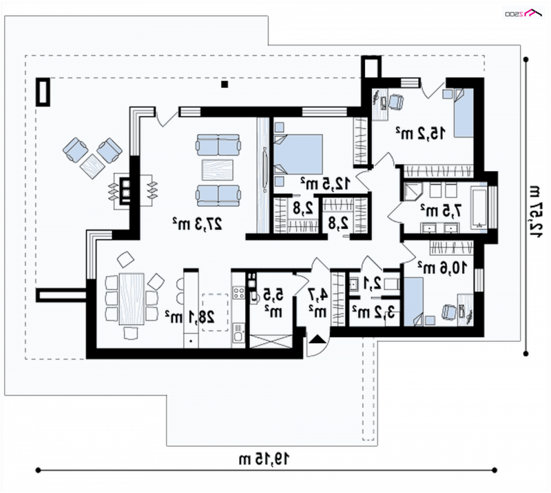 Zx65+ został powiększony o 30m2, co pozwoliło architektowi wygospodarować dodatkowe miejsce na garderoby, pralnię oraz zwiększenie pokoi o ok 2m2.