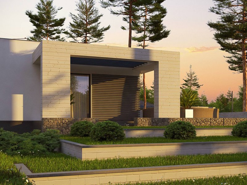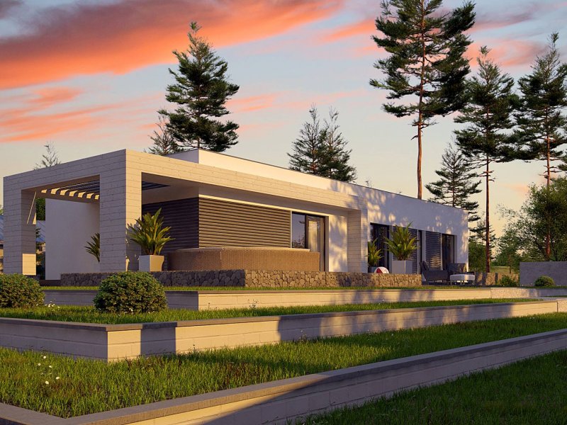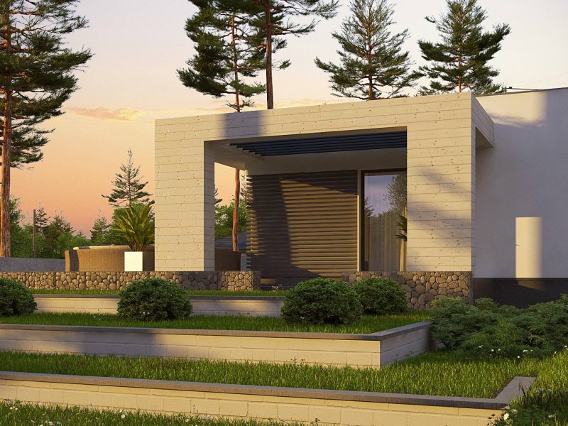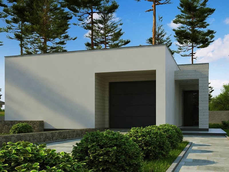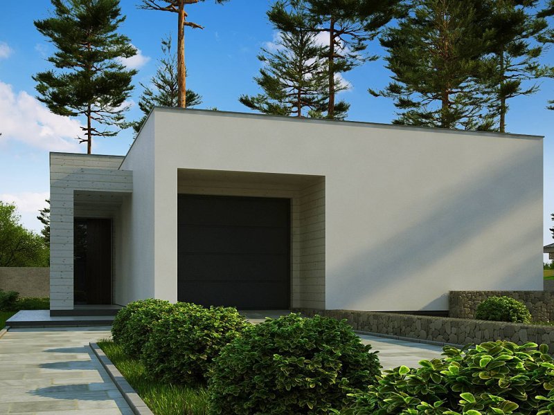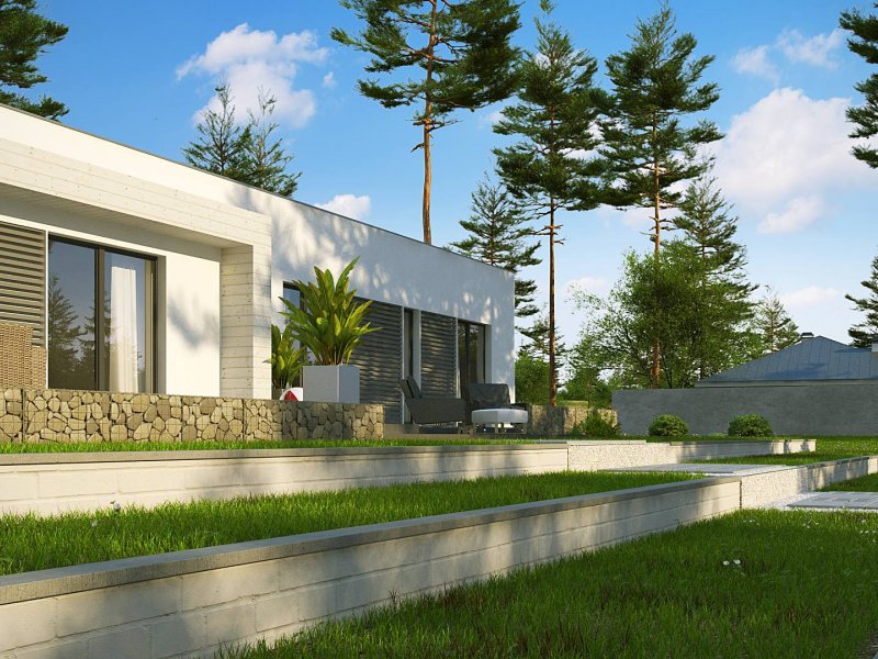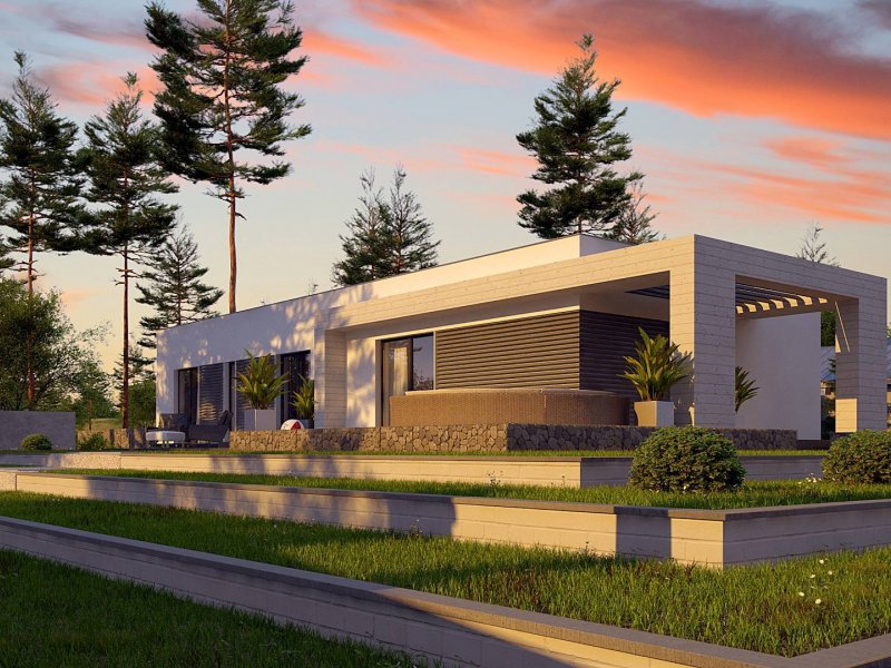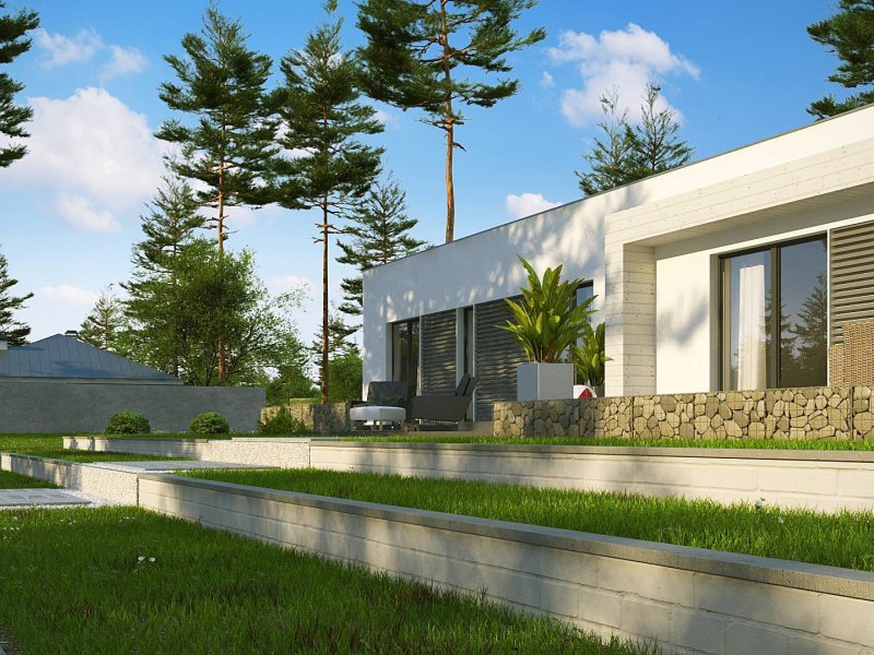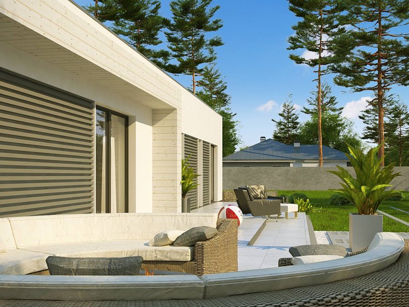 Kolejna propozycja projektu domu na wąską działkę, którego prosta, nowoczesna elewacja wyraża swą wzorową elegancję w kolorze beżu lub kości słoniowej. Do płaskiego dachu architekci dodali panele osłonne przepuszczające światło, które stanowią elementy dekoracyjne w zadaszeniu tarasu.