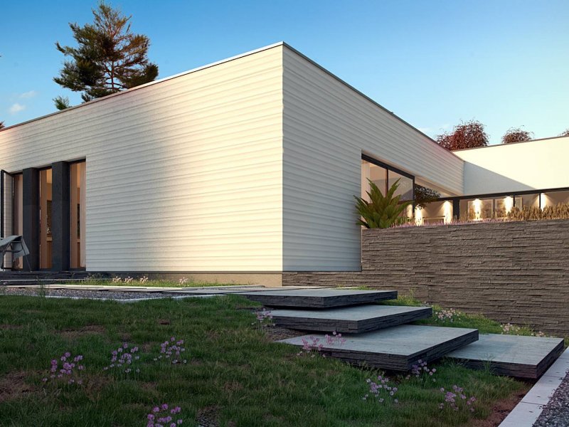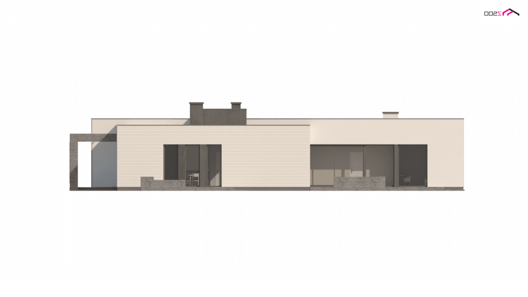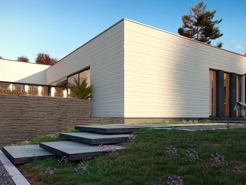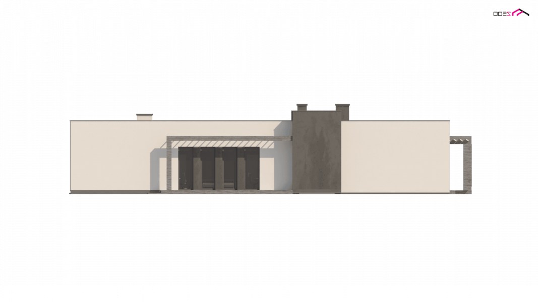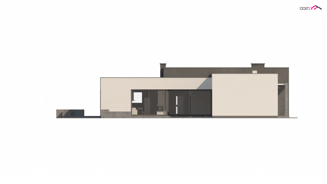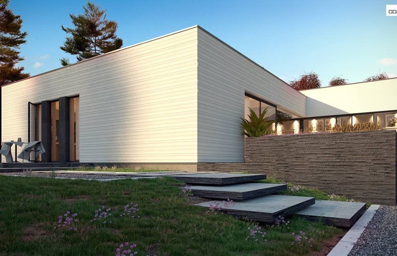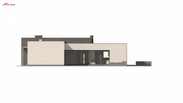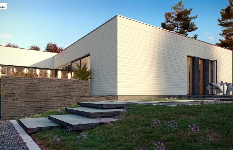 Nowoczesny dom parterowy na rzucie litery L, o surowej elewacji, gładkim białym tynku łączonym z tynkiem fakturowanym lub płytami elewacyjnymi (droższa wersja). Dla kontrastu zastosowano ciemną stolarkę oraz elementy zacieniające. Płaski dach oraz bryła składająca się z 3 sześcianów o różnej wysokości, to kolejne elementy innowatorskiego stylu architektury.