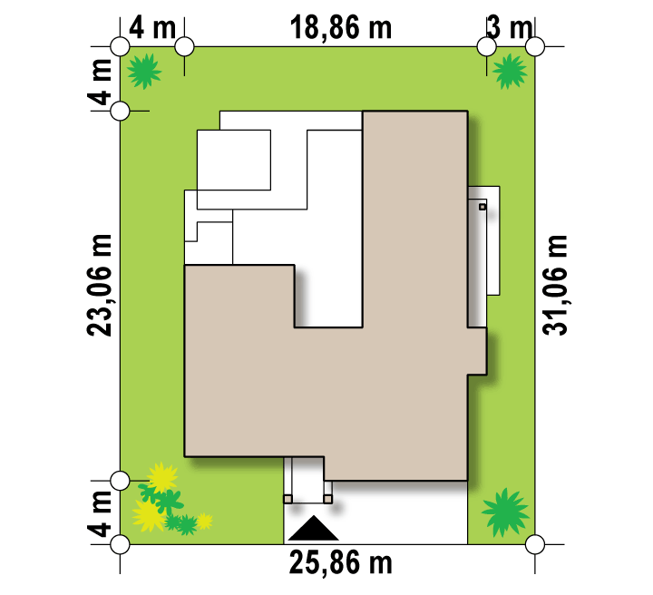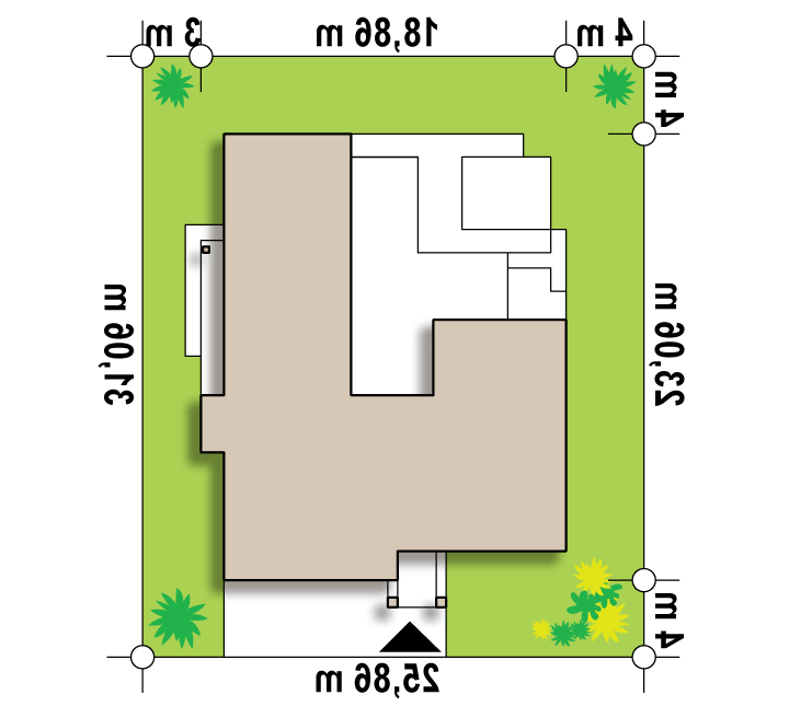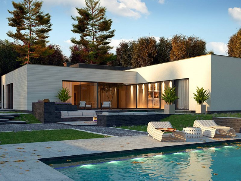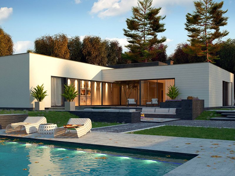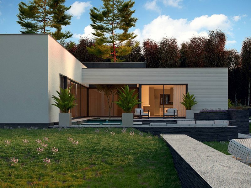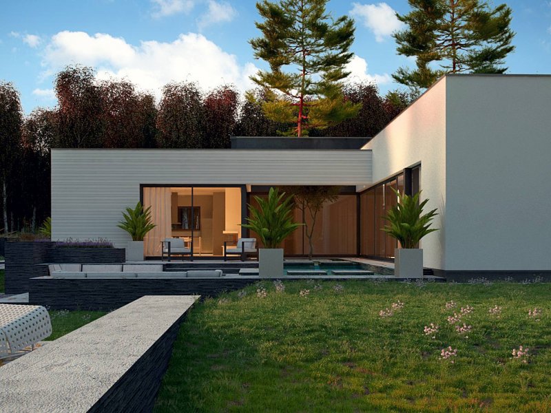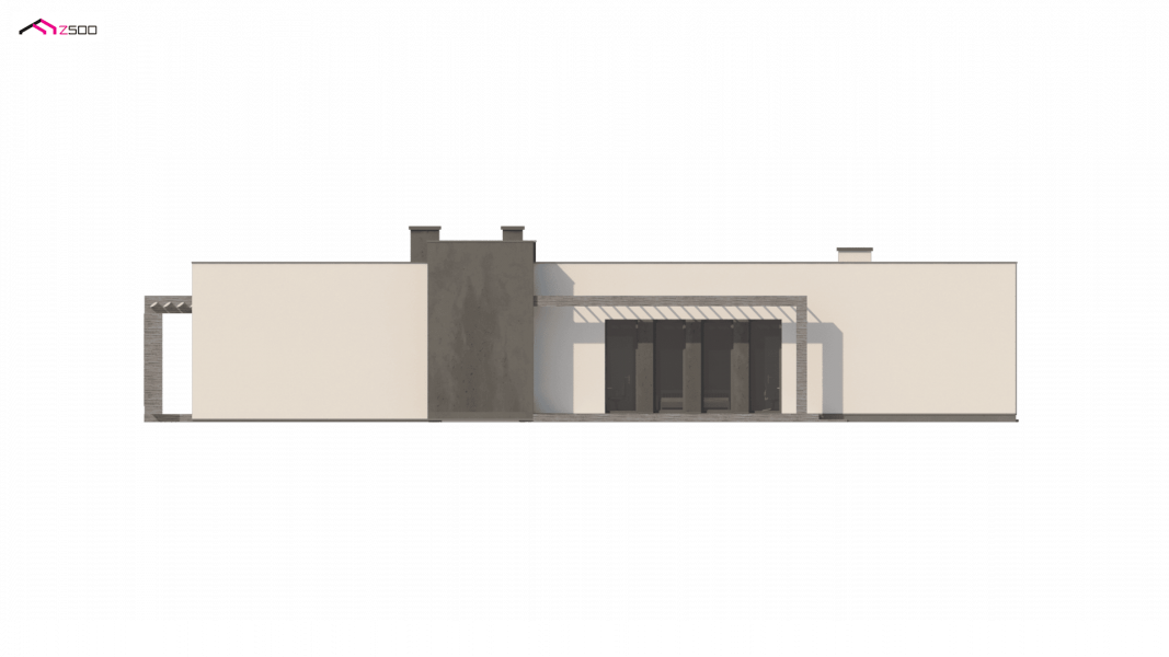 Nowoczesny dom parterowy na rzucie litery L, o surowej elewacji, gładkim białym tynku łączonym z tynkiem fakturowanym lub płytami elewacyjnymi (droższa wersja). Dla kontrastu zastosowano ciemną stolarkę oraz elementy zacieniające. Płaski dach oraz bryła składająca się z 3 sześcianów o różnej wysokości, to kolejne elementy innowatorskiego stylu architektury.