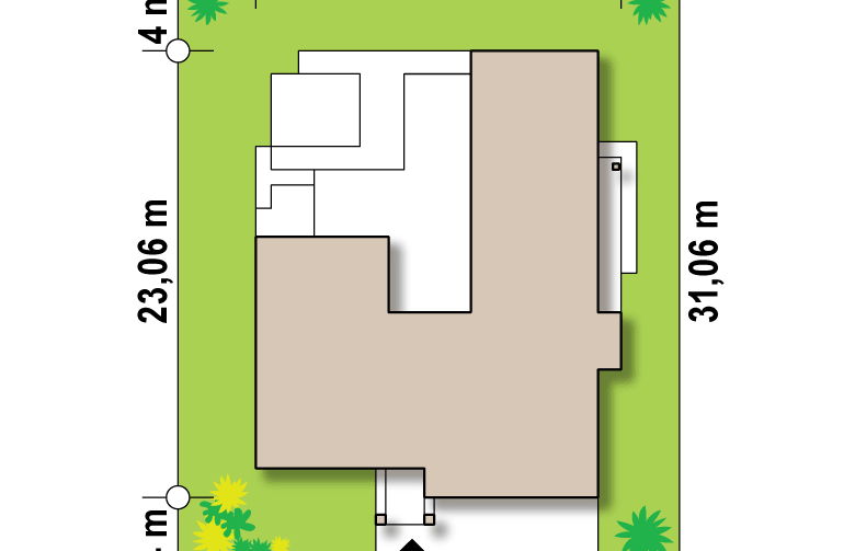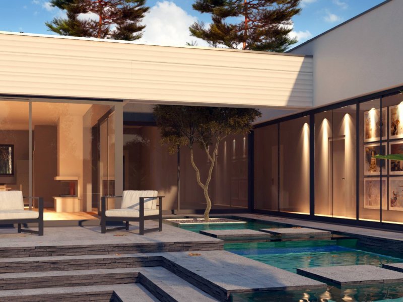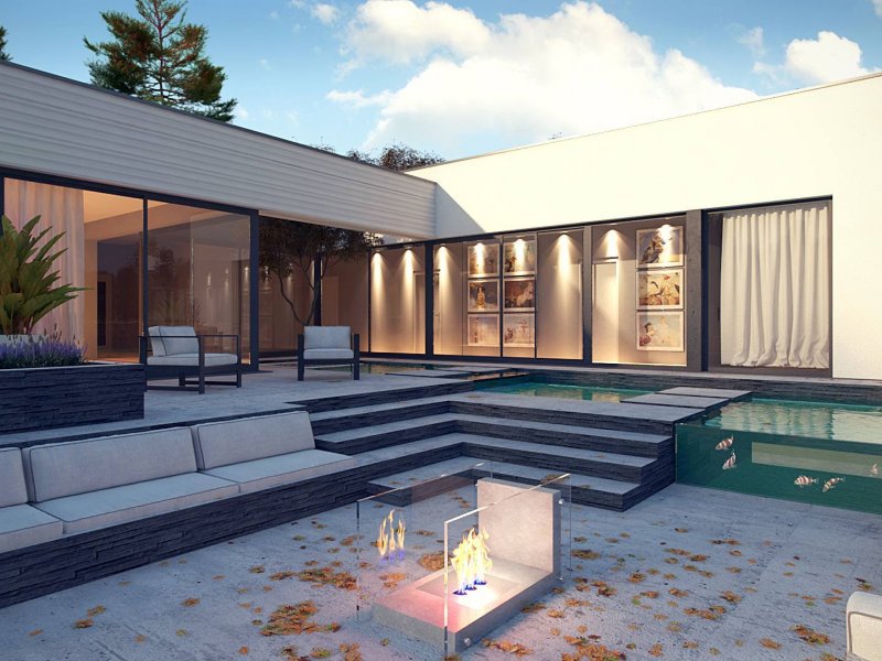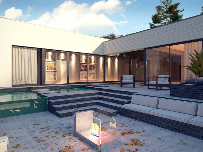 Część frontową stanowi 3 stanowiskowy garaż z pomieszczeniem gospodarczym na paliwo stałe i przejście do sieni. Po wejściu do domu jawi się piękny widok przeszklonej ściany korytarzowej oraz części salonowej. Stanowi to wspaniałą kompozycję a przeszklone, widne, jasne połączenie z ogrodem jest dodatkowym atutem dedykowanego Państwu projektu. Na tarasie umieszczono niewielki, wąski basen, który służy jako relaks i odprężenie. Poniżej zaprojektowano siedziska z paleniskiem pośrodku. Wieczornym spotkaniom w gronie przyjaciół i rozmowom do bladego świtu nie będzie końca… W oddali ogrodu umieszczono główny basen do zabaw dla dzieci.