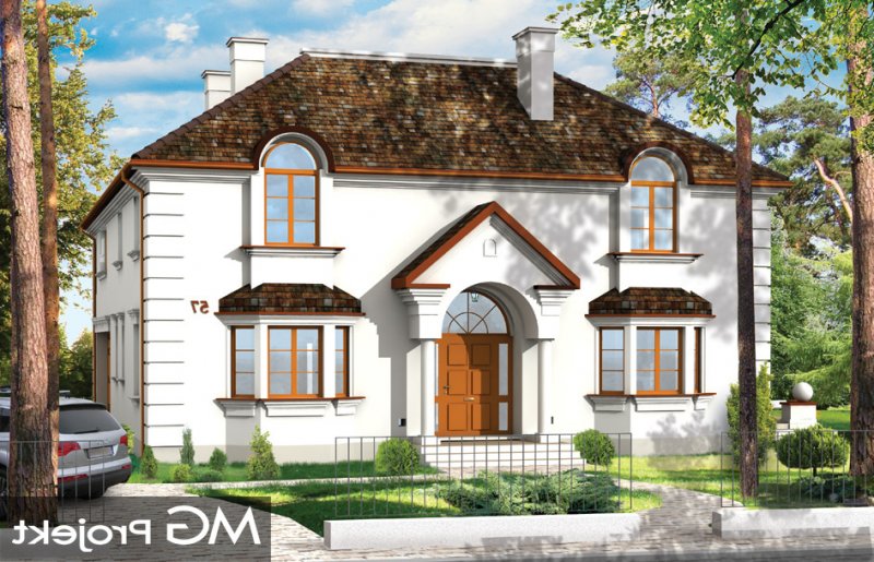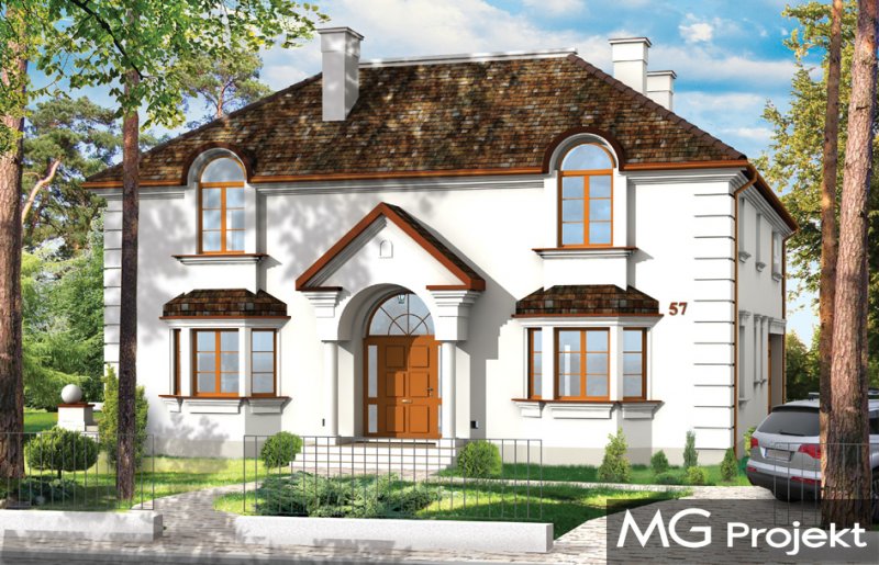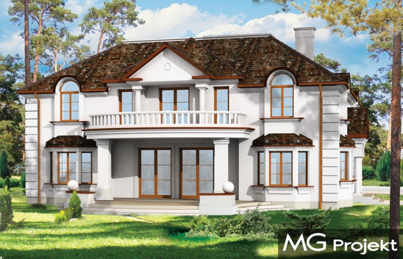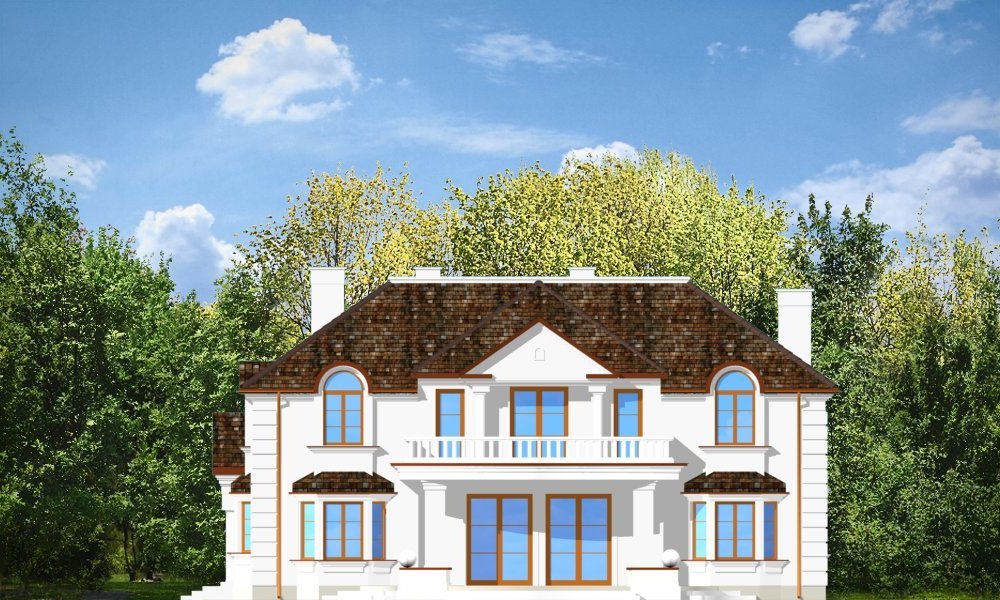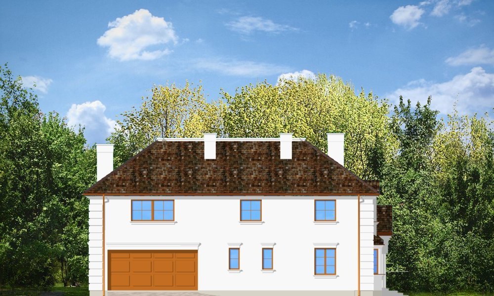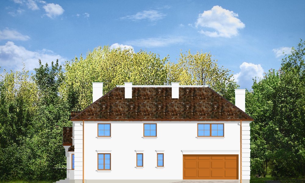 Ambasador 2 to reprezentacyjny, duży dom, na działkę z ogrodem usytuowanym po bocznej stronie. Elewację frontową domu zaprojektowano jako symetryczną, z wykuszami po bokach i ciekawym portykiem wejściowym. W projekcie garaż został umieszczony w tylniej części domu, aby nie zaburzać willowego nastroju wrotami garażowymi lub stojącymi na podjeździe autami. Elewacja ogrodowa budynku ozdobiona została wykuszami oraz eleganckim tarasem z tralkami na piętrze, tworzącym jednocześnie duży podcień dostępny z salonu na parterze. Wnętrze domu to duże pomieszczenia, dodatkowo łączące się przestrzennie, hol z klasycznymi zabiegowymi schodami, czy wysoki hol-galeria na piętrze ze świetlikami w dachu. Zaprojektowana w ten sposób przestrzeń tworzy eleganckie, komfortowe miejsce do życia. Dom posiada częściowe podpiwniczenie. Dostępna jest również wersja odbicia lustrzanego projektu.