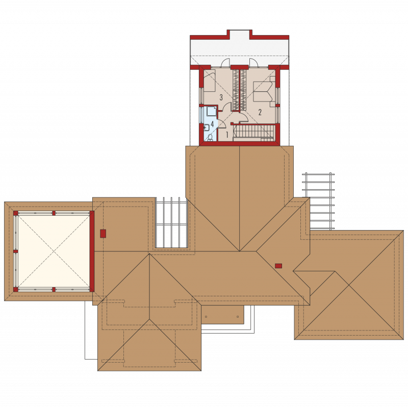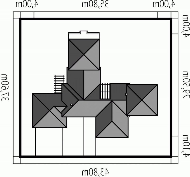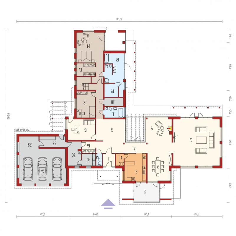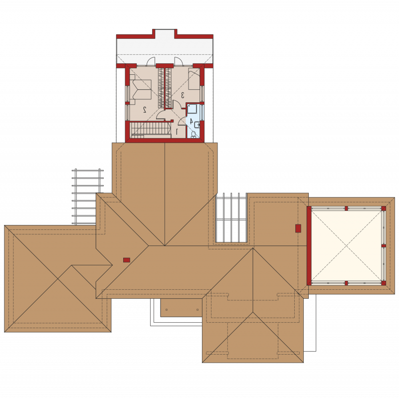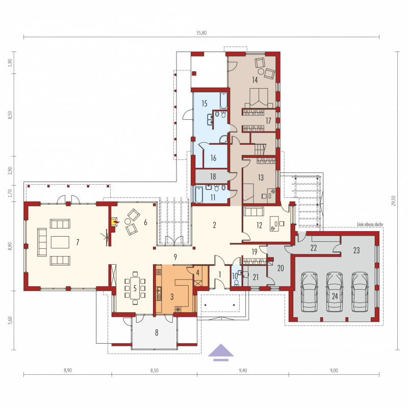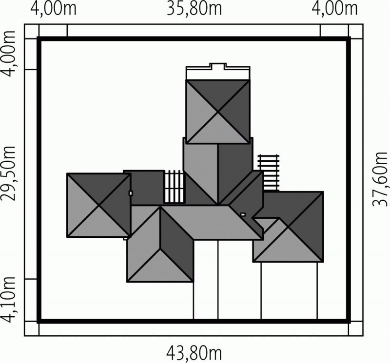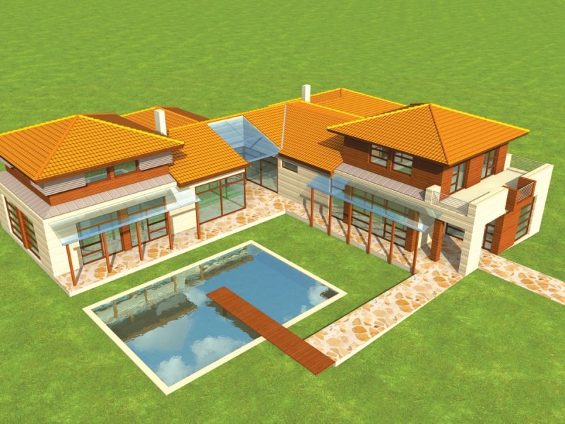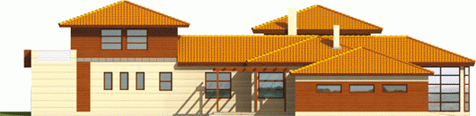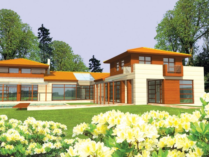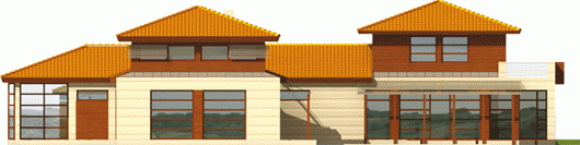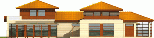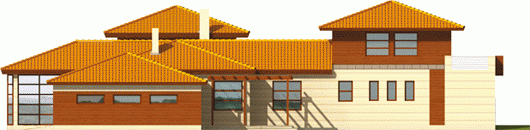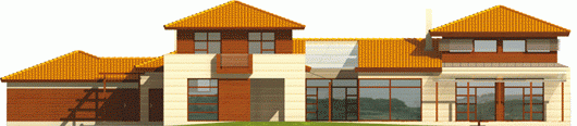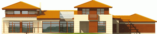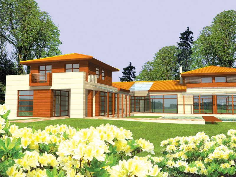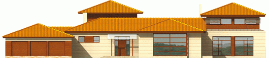 Dom piętrowy niepodpiwniczony z trzystanowiskowym garażem przeznaczony dla 6-7-osobowej rodziny. Ze względu na wielkość i układ funkcjonalny dom ten może pełnić funkcję podmiejskiej rezydencji. Budynek cechuje wyraźny podział na strefy: dzienną i nocną. Na parterze znajduje się przestronny salon pokój kominkowy jadalnia kuchnia ze spiżarnią i oranżeria. Część nocną zaplanowano na dwóch kondygnacjach: na parterze znajduje się sypialnia z pokojem kąpielowym i garderobą dwa pokoje i łazienka na piętrze dodatkowo dwie sypialnie z łazienką. Cześć gospodarczą przewidziano na parterze.