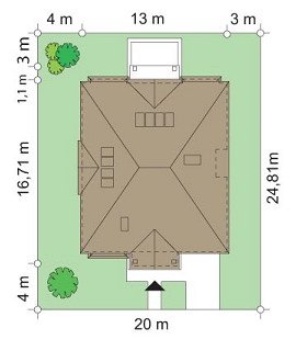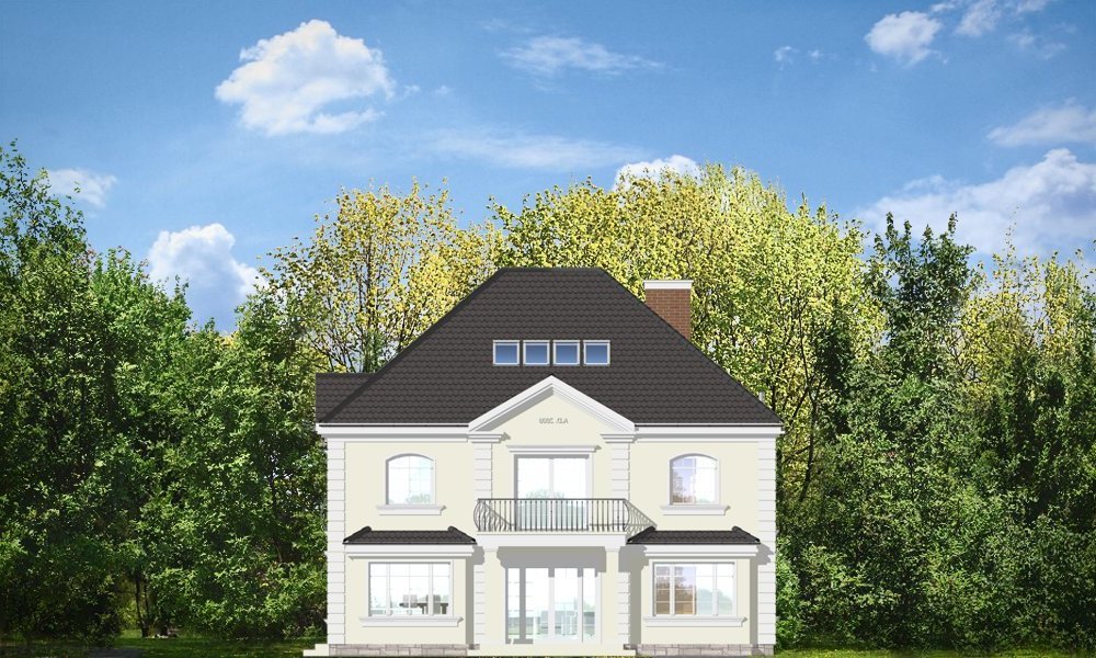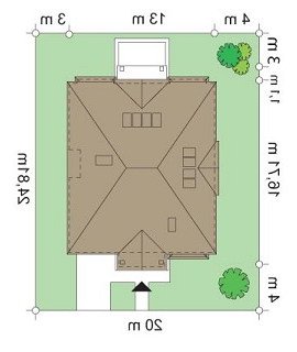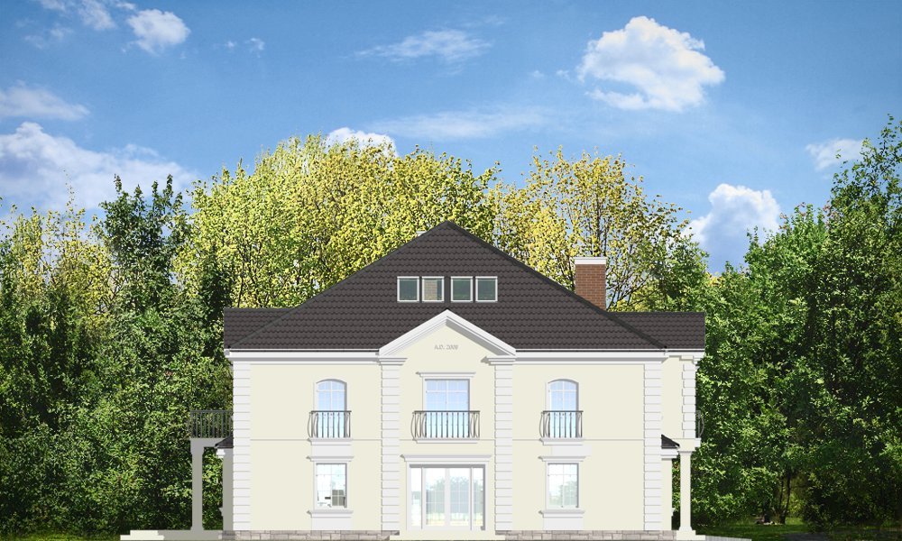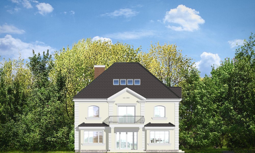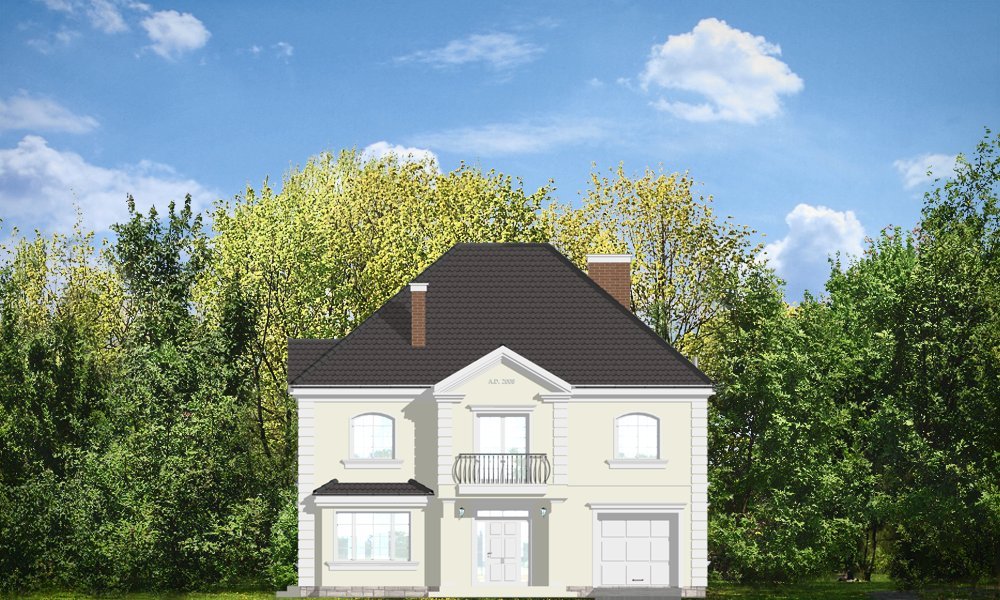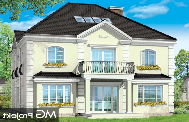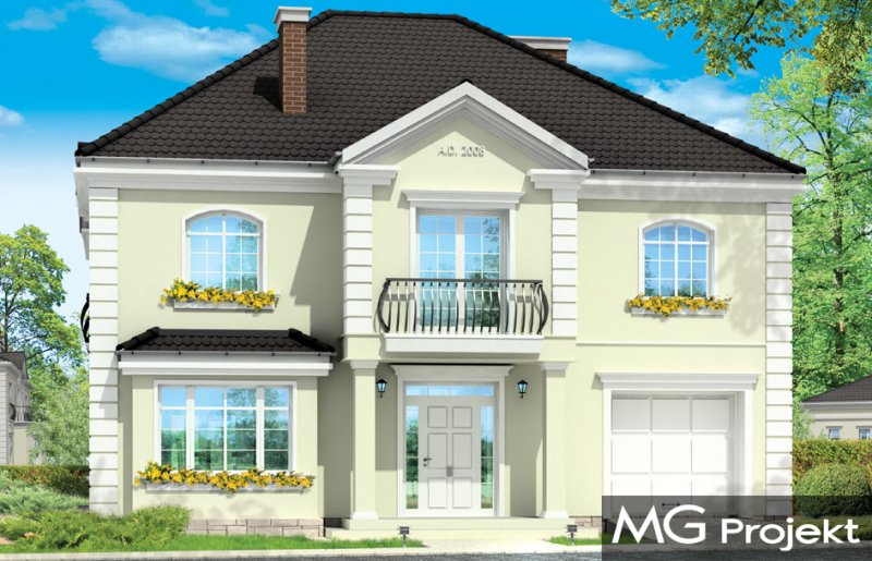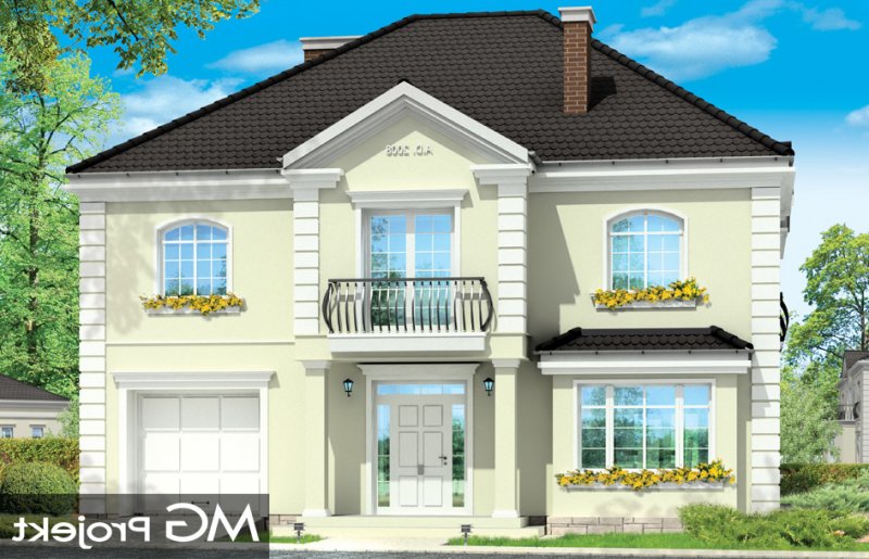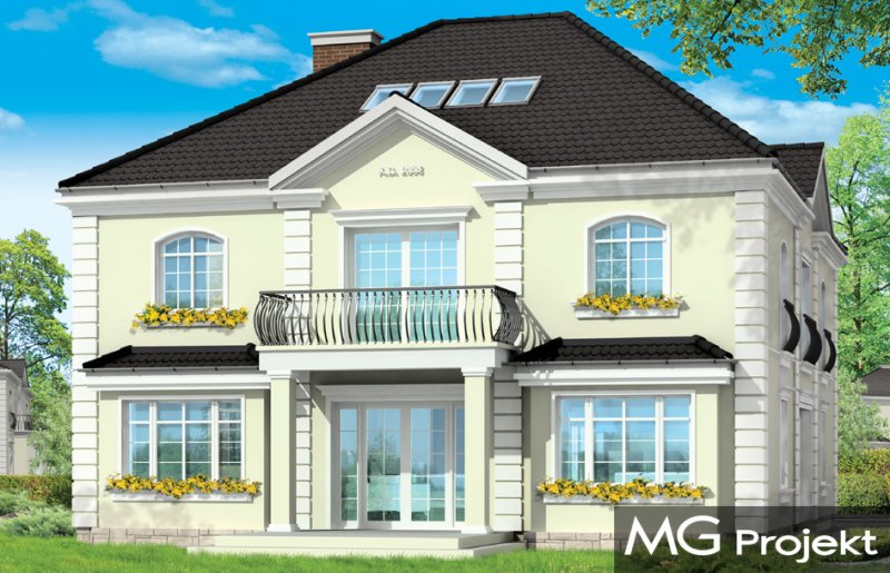 Elegancki to wykwintny, klasyczny w formie dom. Budynek o prostej bryle i układzie wnętrz jest zarazem wyrafinowany i intrygujący. Z zewnątrz dom nawiązuje do willi okresu międzywojennego, w nowym ujęciu. Projekt zawiera elementy nowoczesnych uproszczeń, co potęguje jego elegancję. Dom dzięki swoim niewielkim wymiarom zewnętrznym zmieści się na małą, szczególnie na wąską działkę. Styl domu sugeruje budowę budynku o dużej powierzchni i kubaturze - ten projekt jednak został stworzony bez zbędnej rozrzutności i bez niepotrzebnej straty cennych metrów. Wnętrze parteru zaprojektowane jest wokół przestronnego holu z wyeksponowanymi zabiegowymi schodami. Z holu przechodzimy do pokoju dziennego i do jadalni. W części dziennej wyodrębniono pokój telewizyjny mogący służyć również za bibliotekę, oraz pokój gościnny z łazienką, który może również być wykorzystany jako gabinet. Kuchnia i garaż znajdują się od strony frontowej. Przedsionek połączony jest z garażem - przez szatnię, oraz z kuchnią - przez spiżarnię. Na piętrze zaprojektowano apartament Państwa domu, z łazienką, garderobami i tarasem. Następnie dodatkowy apartament - np. dla dorosłego dziecka lub starszej osoby. Dodatkowo zaplanowano jeszcze dwie sypialnie z łazienką dostępną z holu. Hol został powiększony o bibliotekę - ewentualnie wieczorny salonik. W projekcie dach nad piętrem kryje duży strych, który można też wykorzystać na cele użytkowe.