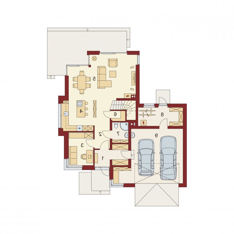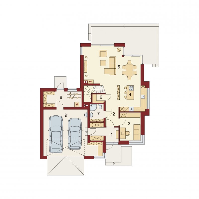 Na parterze znajduje się przestronny salon z jadalnią i wyjściem na taras, otwarta, ale łatwa do wydzielenia w ramach adaptacji kuchnia ze spiżarnią, oraz gabinet, który dzięki położeniu niedaleko wiatrołapu i łazienki, doskonale sprawdzi się także jako biuro w domu, pokój gościnny lub dodatkowa sypialnia. Pierwszorzędną funkcjonalność zapewnia dodatkowe pomieszczenie gospodarcze, przemyślnie zlokalizowane pomiędzy wiatrołapem a dwustanowiskowym garażem, z którego z kolei dostępna jest duża kotłownia z praktycznym wyjściem na zewnątrz.
