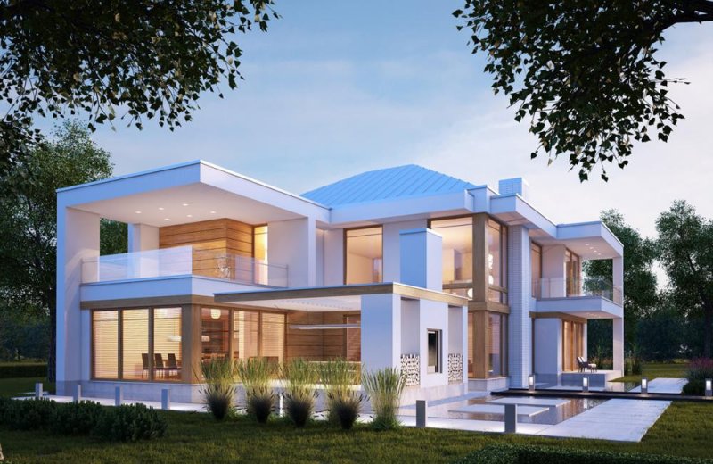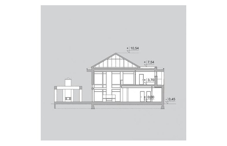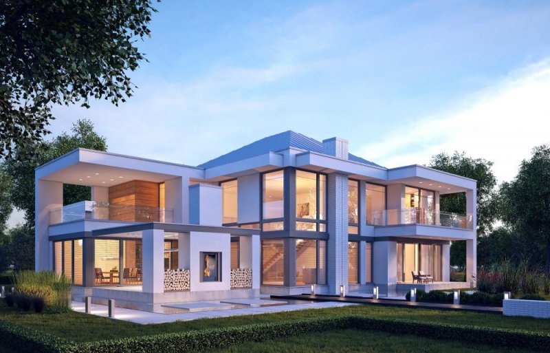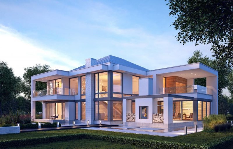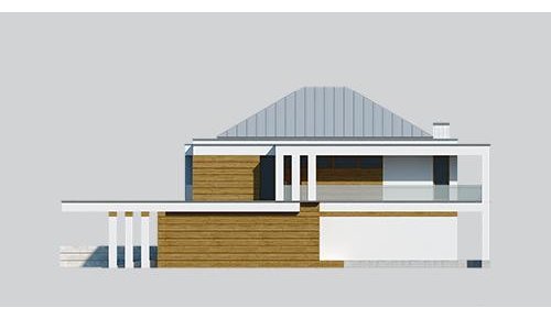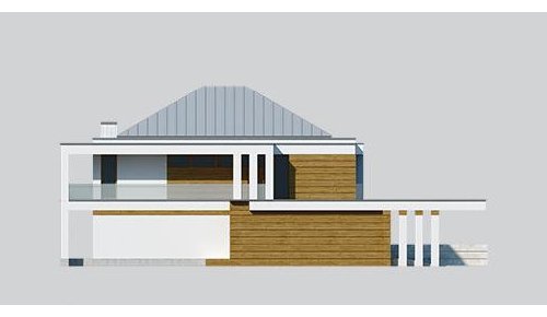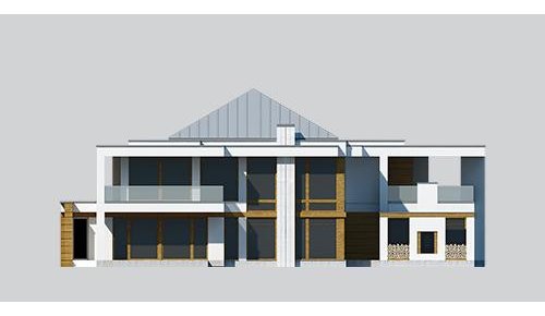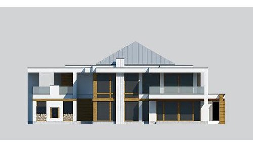 Elewacje: tynk silikonowy, kolor biały; płyty Rockpanel Colours firmy Rockwool; płyty cięte z kamienia naturalnego – trawertynu; płyty HPL