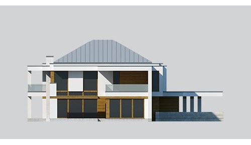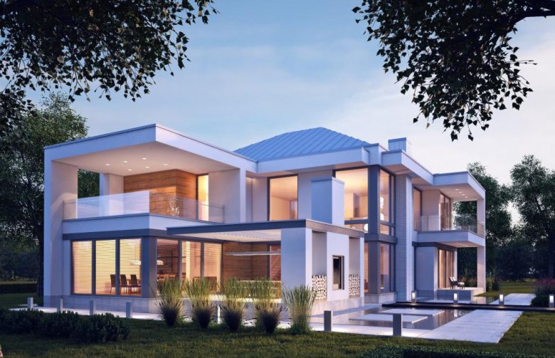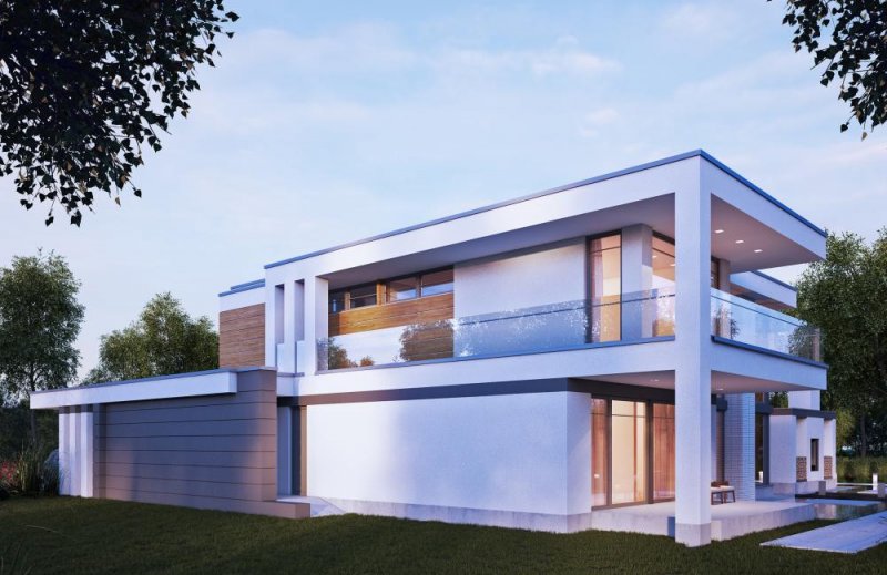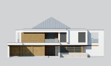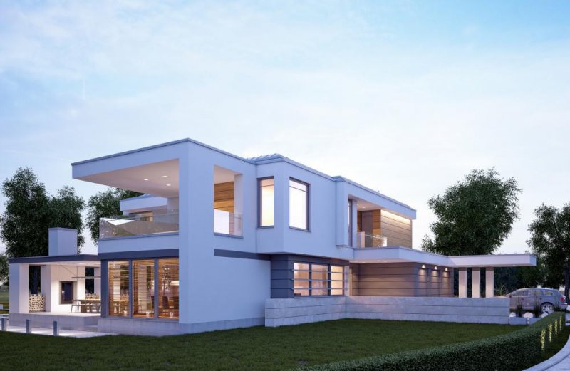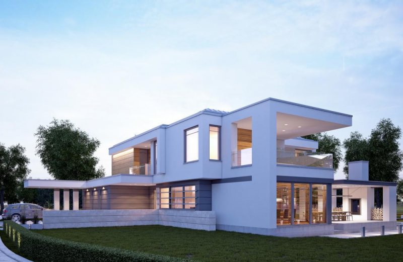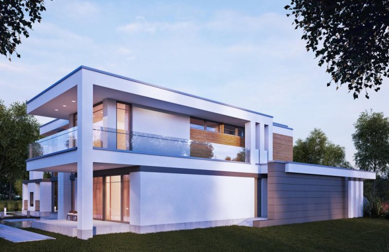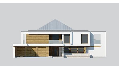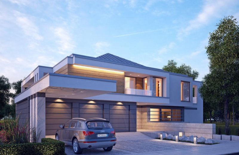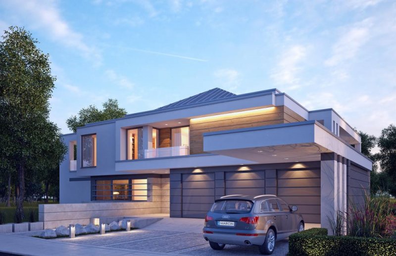 Projekt nowoczesnego domu piętrowego z antresolą i trzystanowiskowym garażem w bryle budynku.