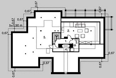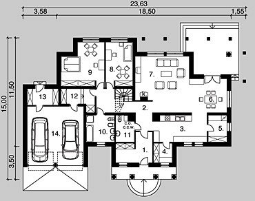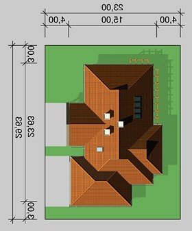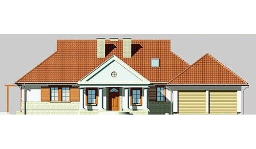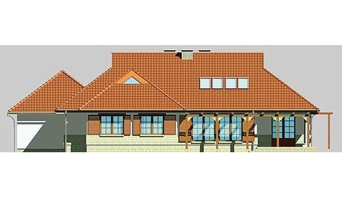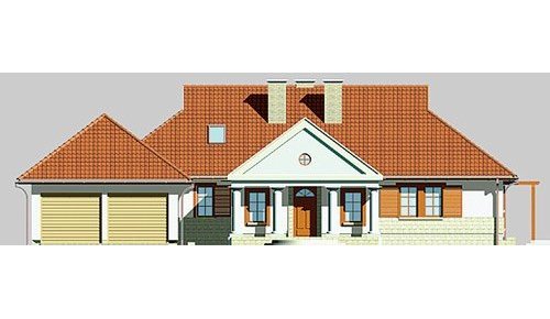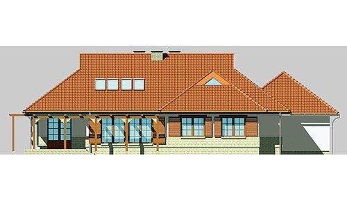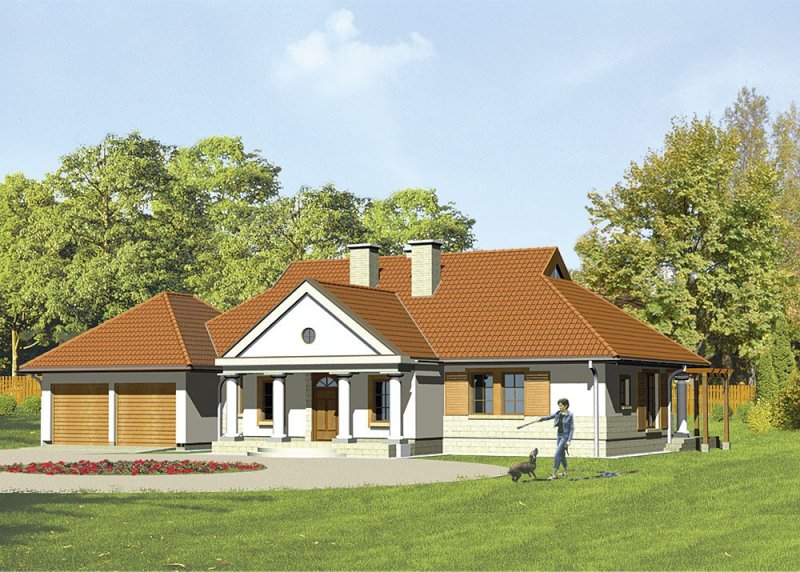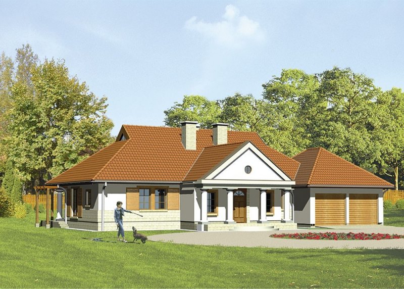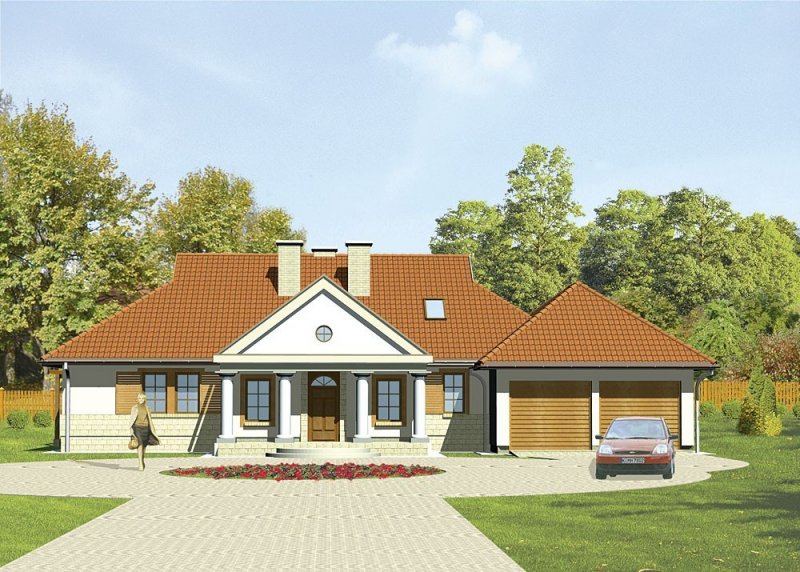 Dom jednorodzinny, parterowy, z poddaszem użytkowym i dwustanowiskowym garażem.