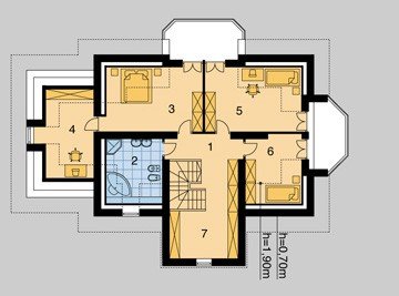 Dom jednorodzinny, parterowy, z poddaszem użytkowym i jednostanowiskowym garażem.