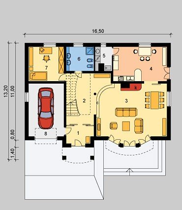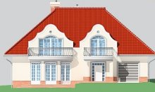 Dom jednorodzinny, parterowy, z poddaszem użytkowym i jednostanowiskowym garażem.