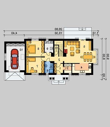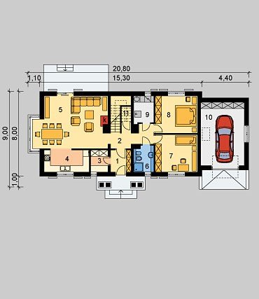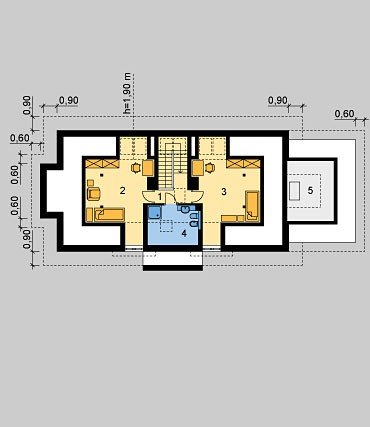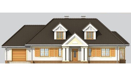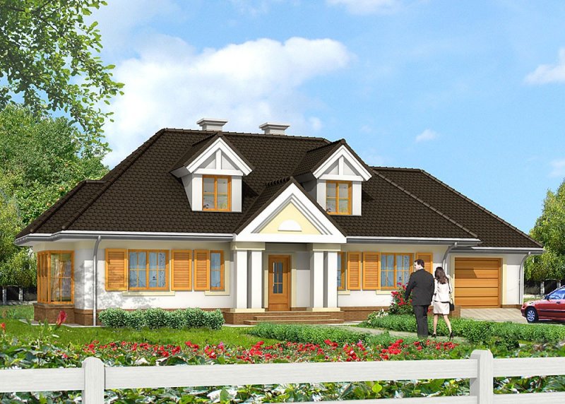Dom jednorodzinny, niepodpiwniczony, z poddaszem użytkowym i jednostanowiskowym garażem.