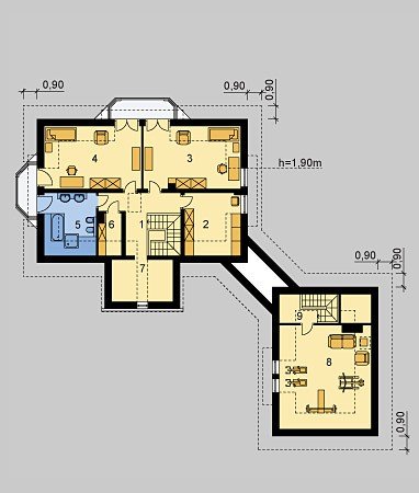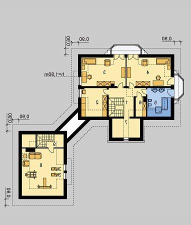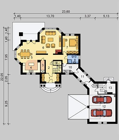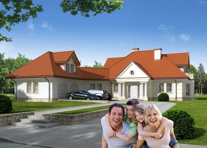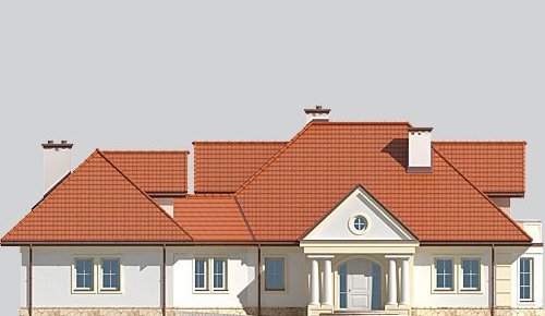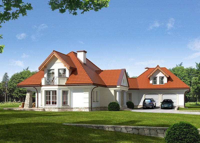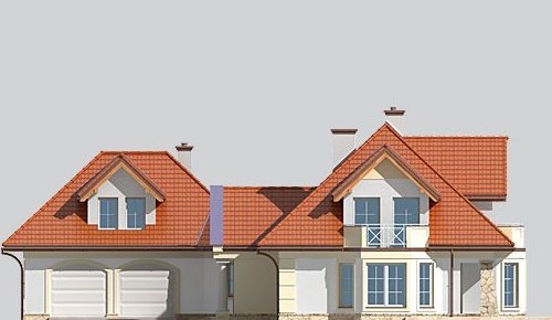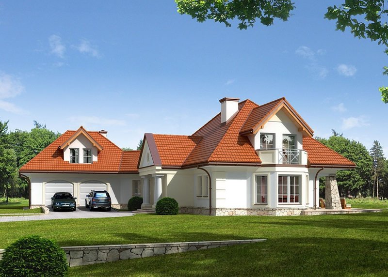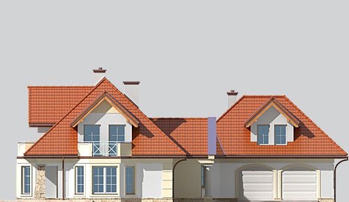 Dom jednorodzinny, parterowy, z poddaszem użytkowym i dwustanowiskowym garażem.