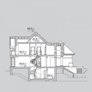- Ściany fundamentowe: z bloczków betonowych o gr. 25 i 30 cm ocieplone styropianem 'GOLD fundament' firmy Termo Organika o gr. 20 cm