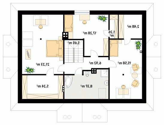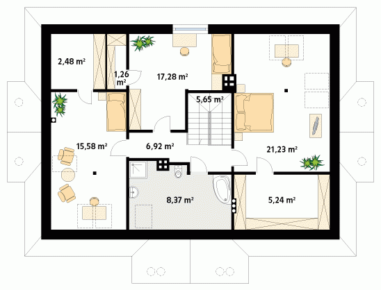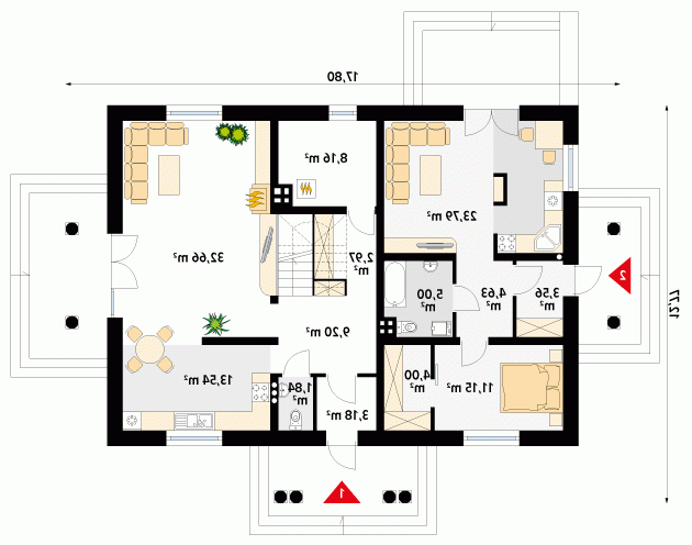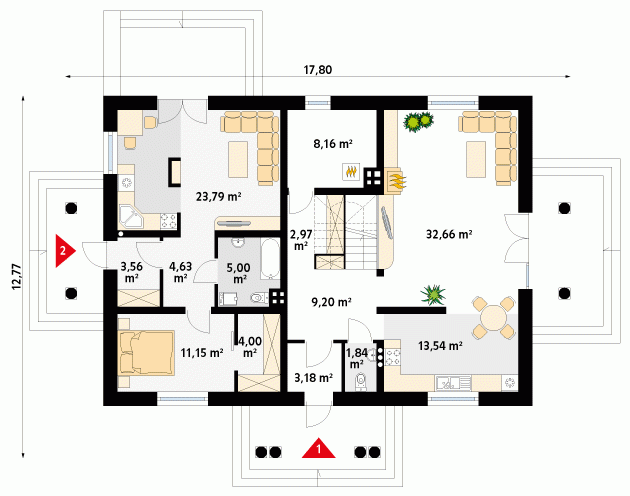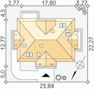 Dom dwurodzinny, parterowy z użytkowym poddaszem. W prostej bryle zaprojektowano dwa mieszkania z oddzielnymi wejściami. Poddasze dostępne z klatki schodowej zlokalizowanej w części I. domu.