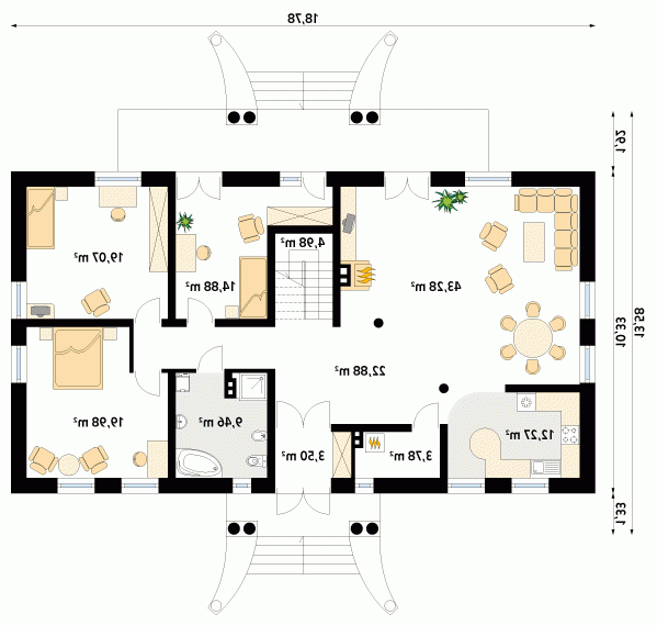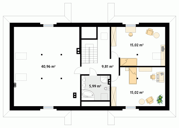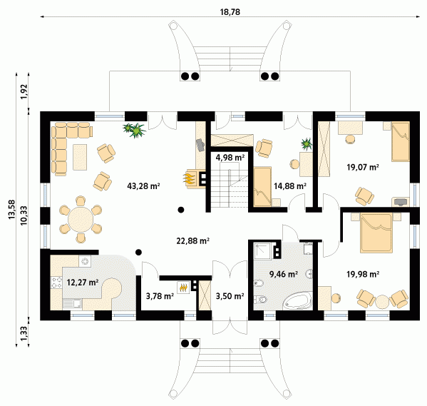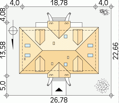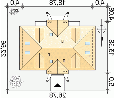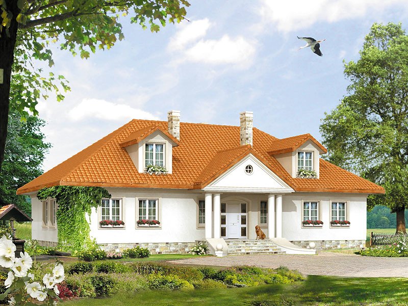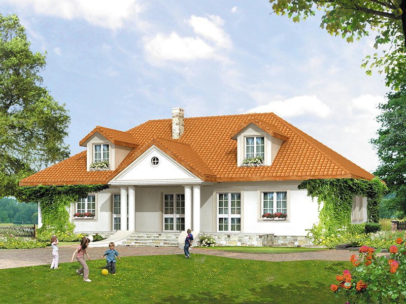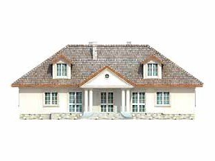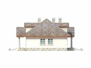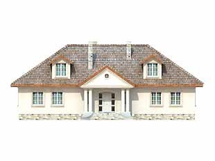 Dom parterowy z poddaszem użytkowym, przeznaczony dla 4 – 5-osobowej rodziny. Tradycyjna bryła o stylu dworkowym z dachem czterospadowym.