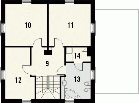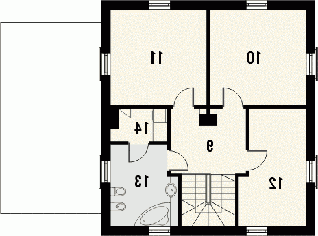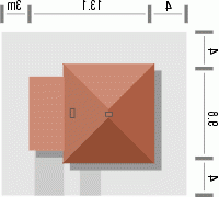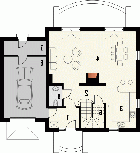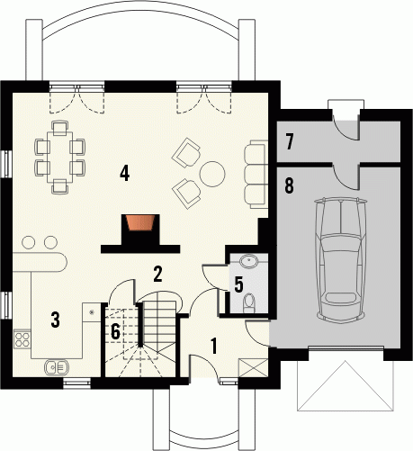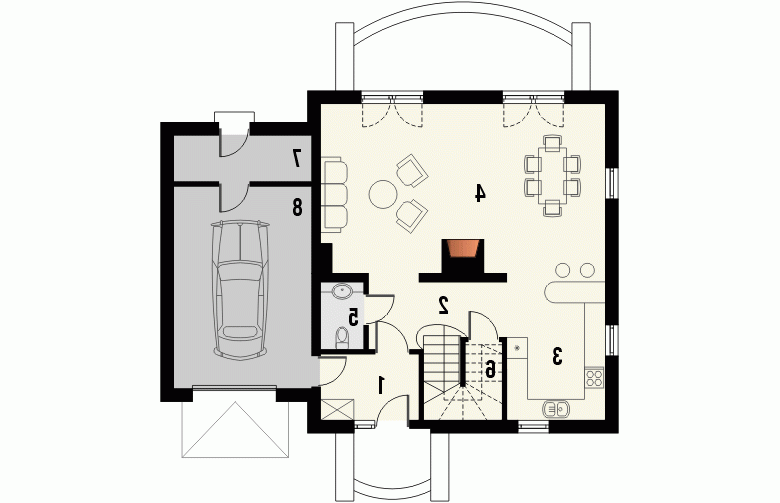 Budynek niepodpiwniczony piętrowy z garażem. Na parterze zaprojektowano pokój dzienny, jadalnię, kuchnię, spiżarnię, dodatkowy pokój, wc oraz garaż z pomieszczeniem gospodarczym. Na piętrze znajdują się 3 pokoje i łazienka z pomieszczeniem gospodarczym. Dostępna wersja projektu bez garażu i w zabudowie bliźniaczej. Dokumentacja również w odbiciu lustrzanym.