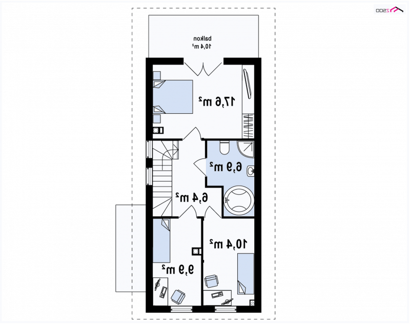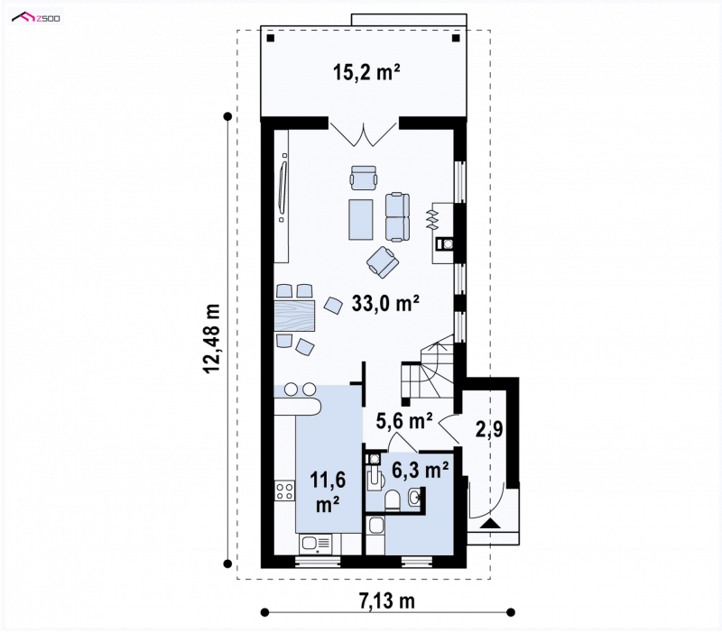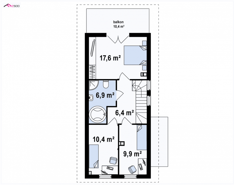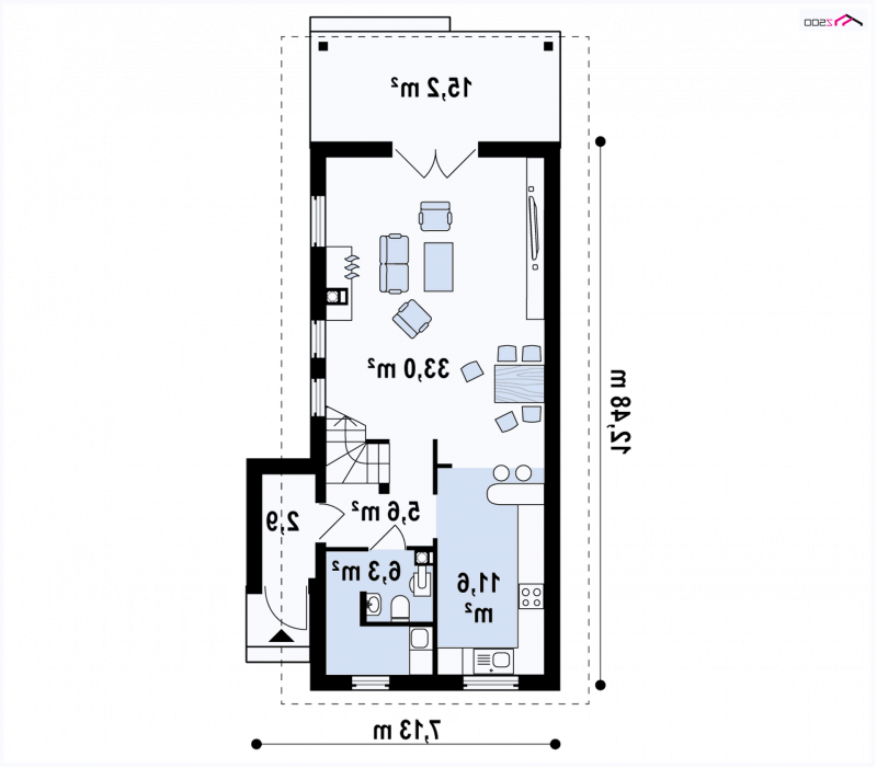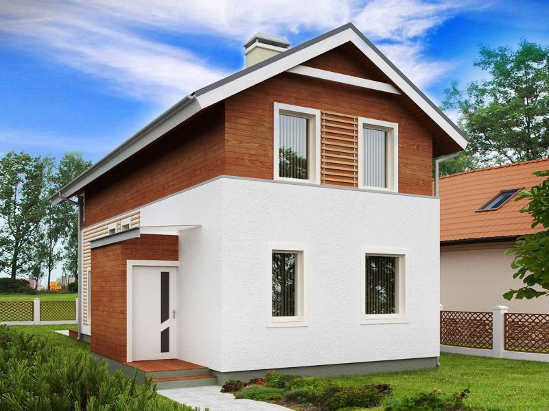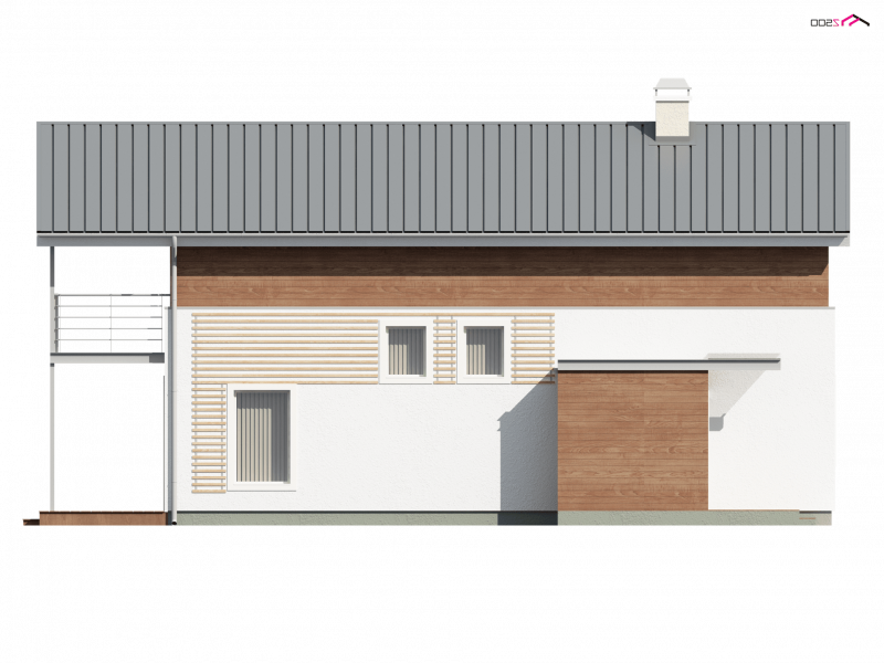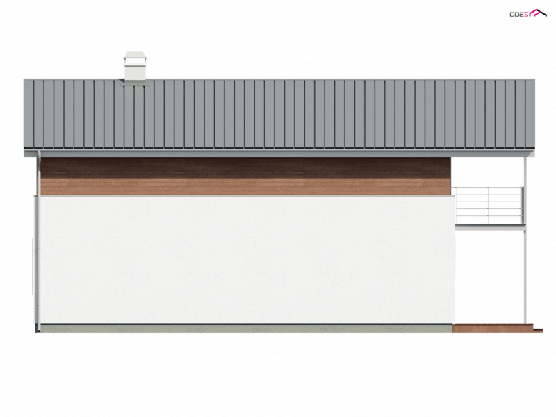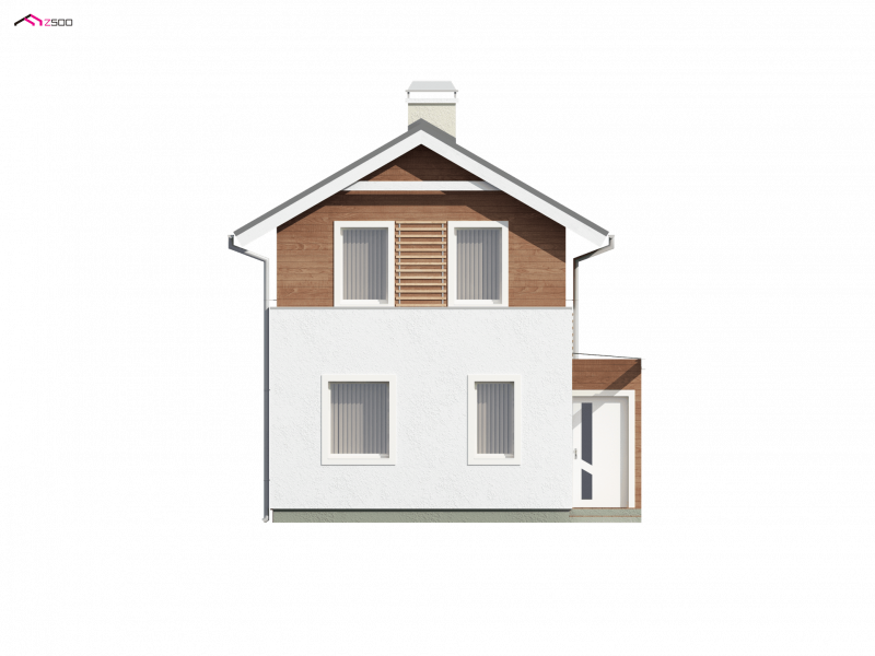 Z25 to dom o współczesnym wyglądzie, przystosowany do wykorzystania na bardzo wąskiej, nietypowej działce. Można zrezygnować z ganku, co spowoduje, że dom będzie jeszcze węższy i w skrajnej sytuacji zmieści się na działce o szerokości ~12m.
