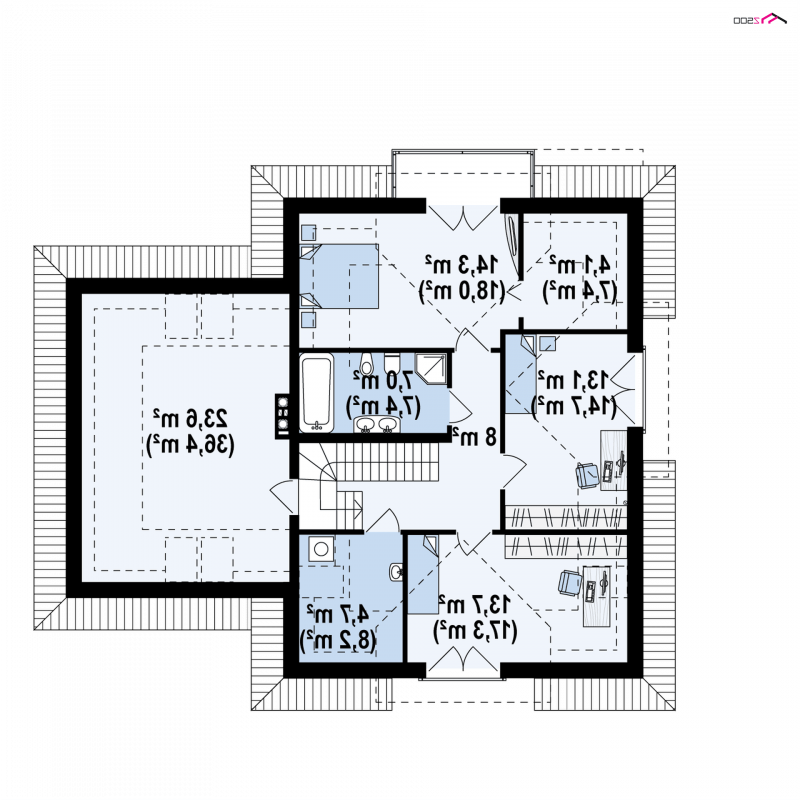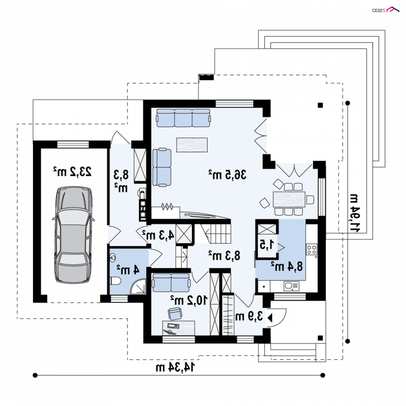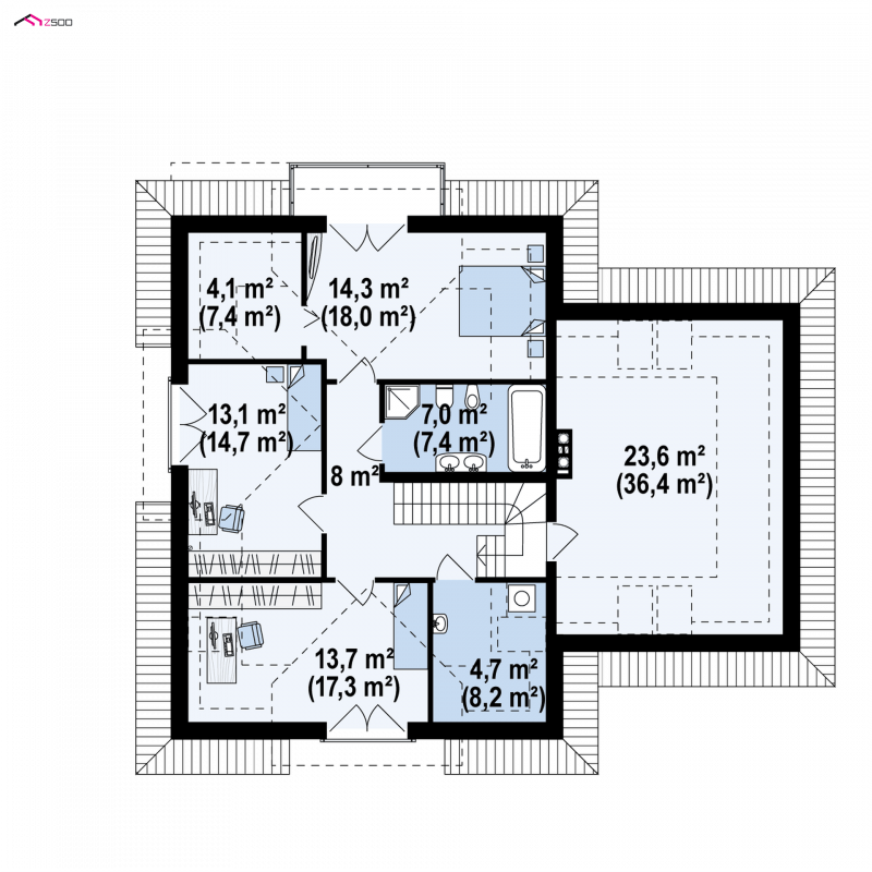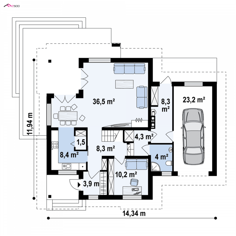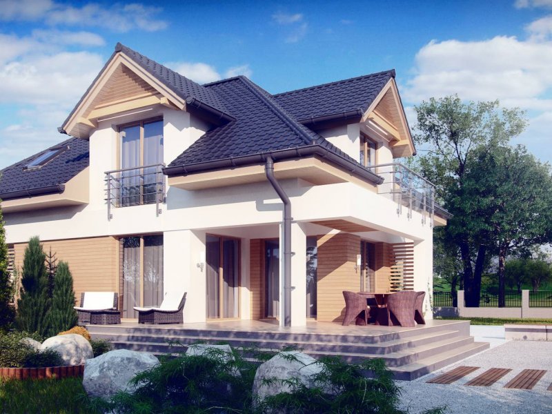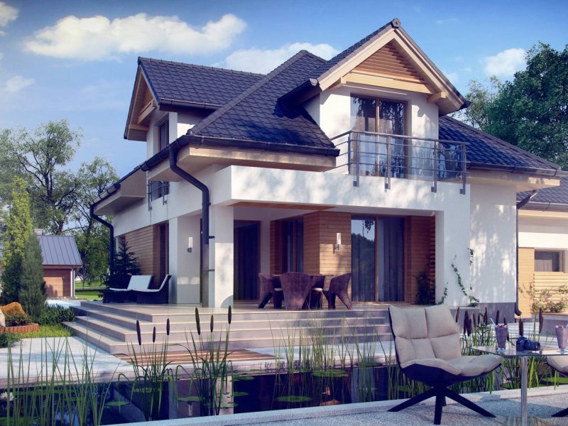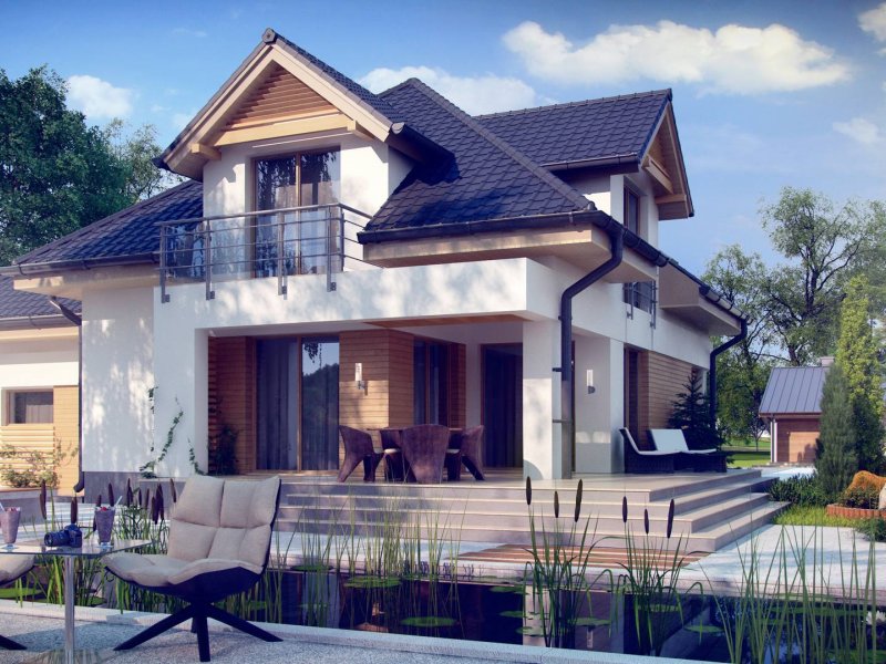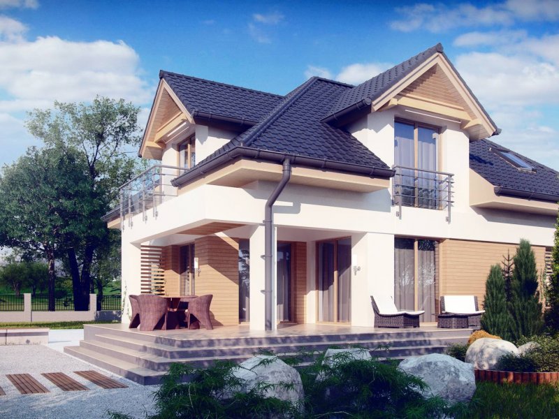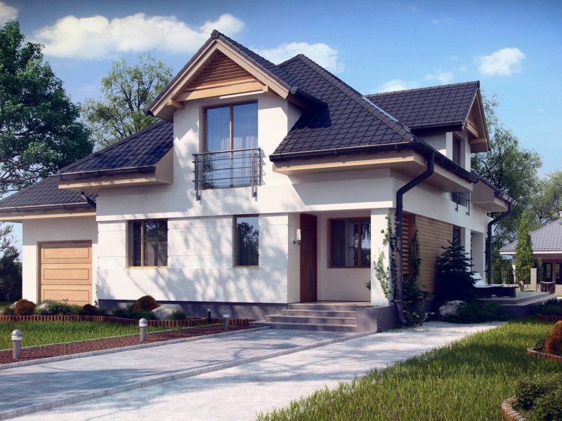 Z284 to zgrabny dom z poddaszem użytkowym i garażem jednostanowiskowym. Urozmaicona bryła, lukarny, podcięcia oraz nowoczesny charakter wykończenia elewacji decydują o jego atrakcyjności.