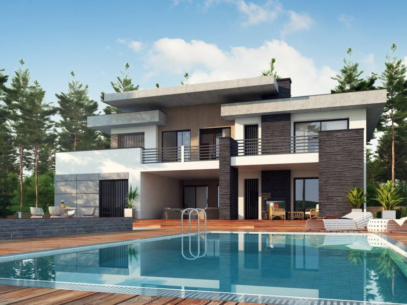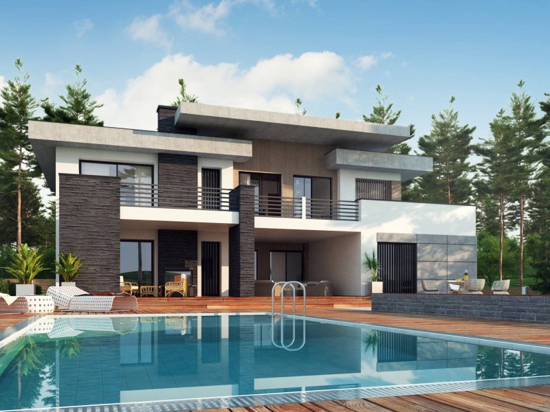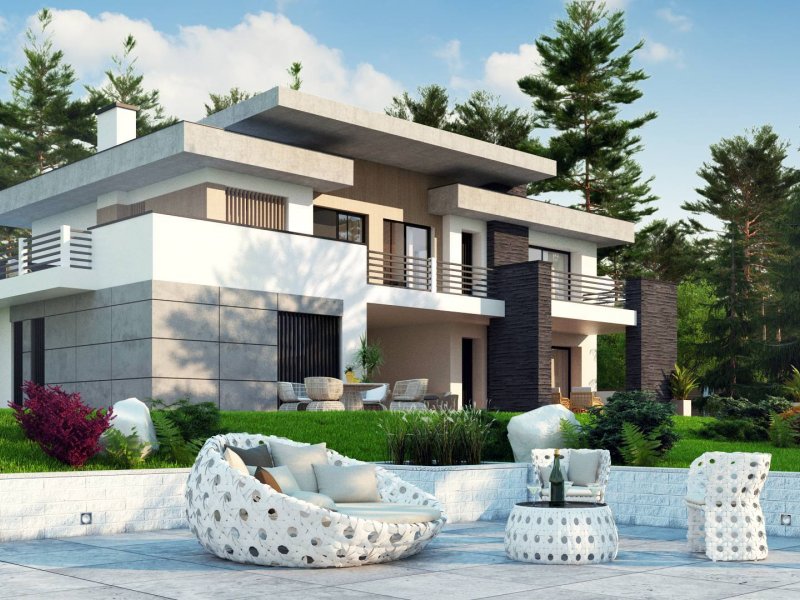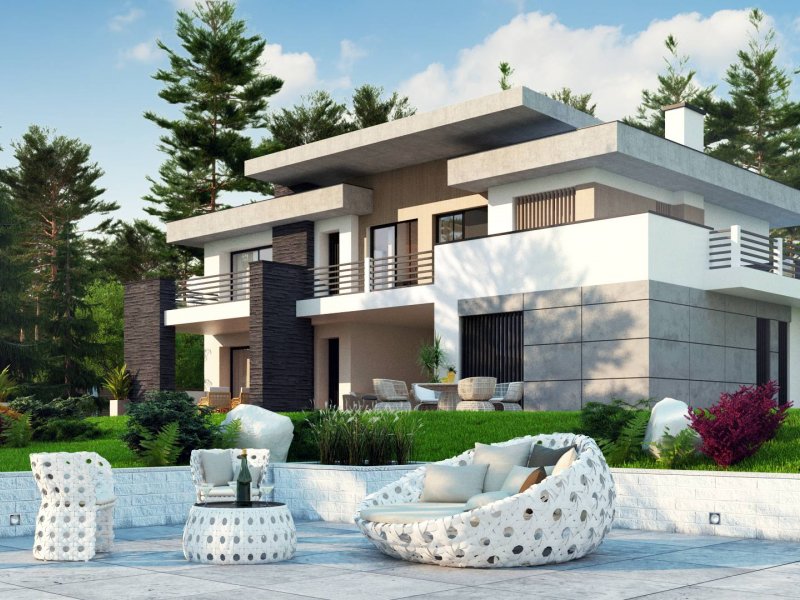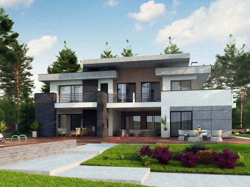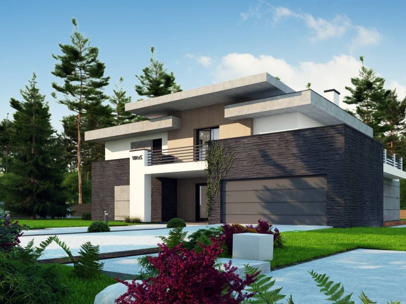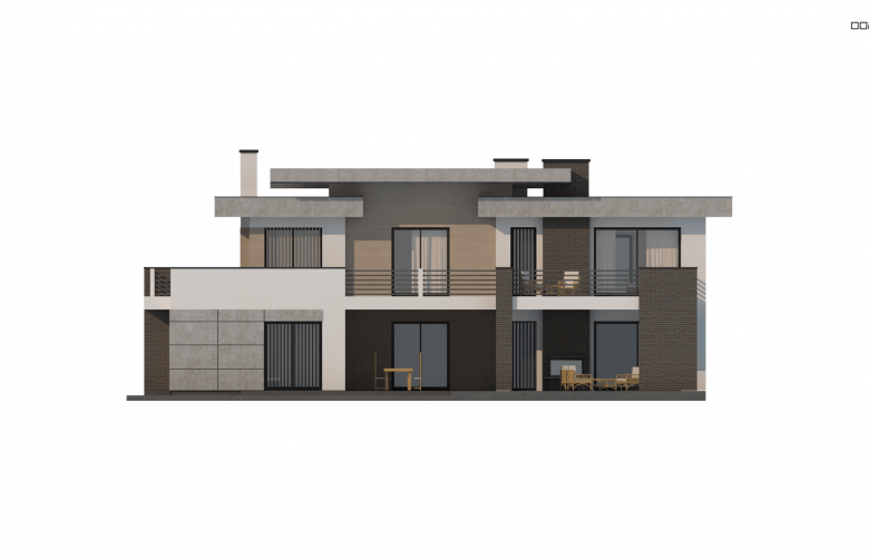 Dom prezentuje się okazale, jest nowoczesny, z dużymi okapami, posiada płaski dach i dwustanowiskowy garaż. Do wykończenia go z zewnątrz użyto 4 materiałów elewacyjnych: drewna, białego tynku, czarnego kamienia i surowego betonu. Do elewacji dodano elementy dekoracyjne w postaci pionowych żaluzji, które jednocześnie pełnią funkcję osłony słonecznej.