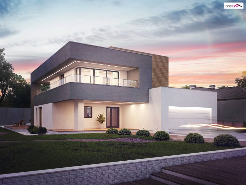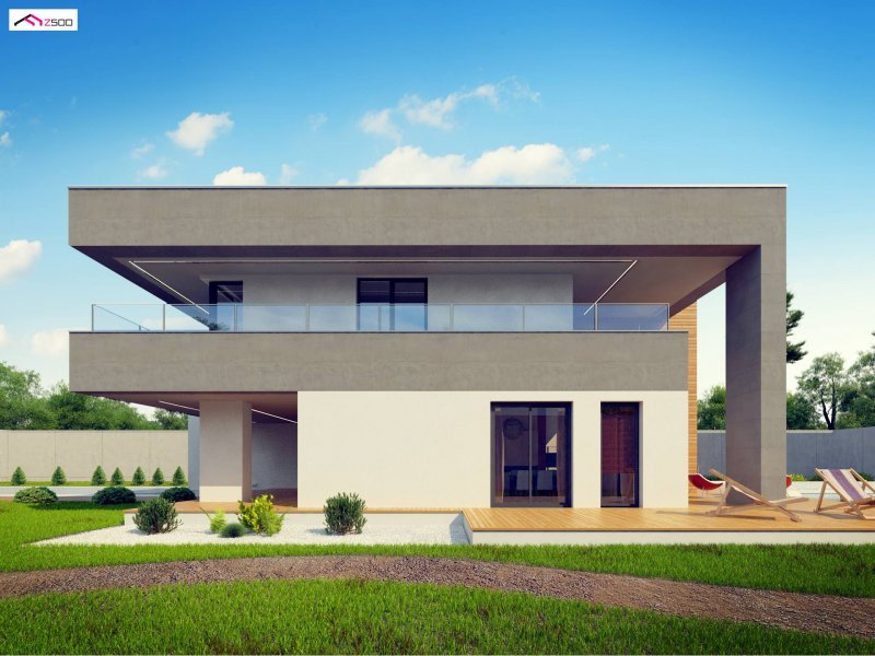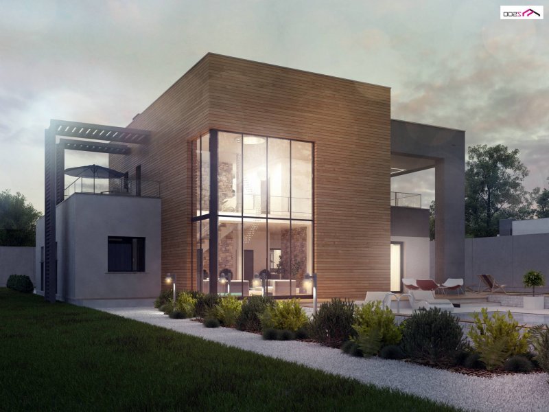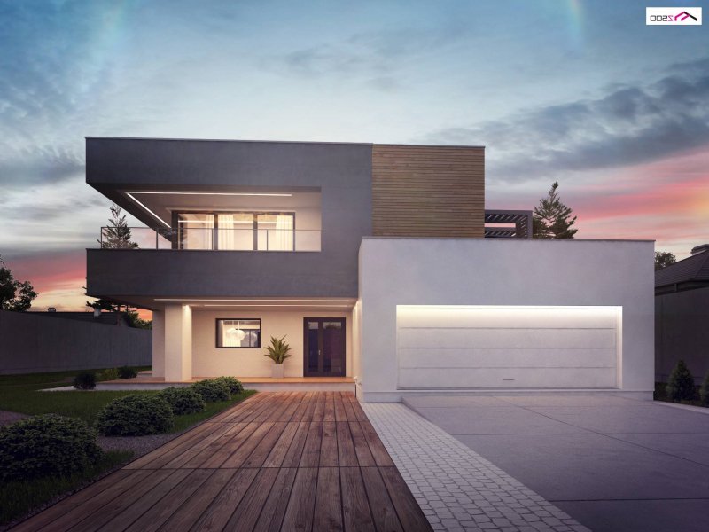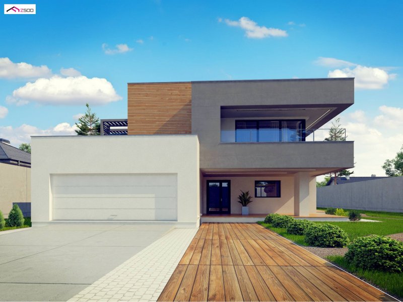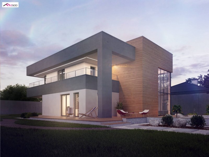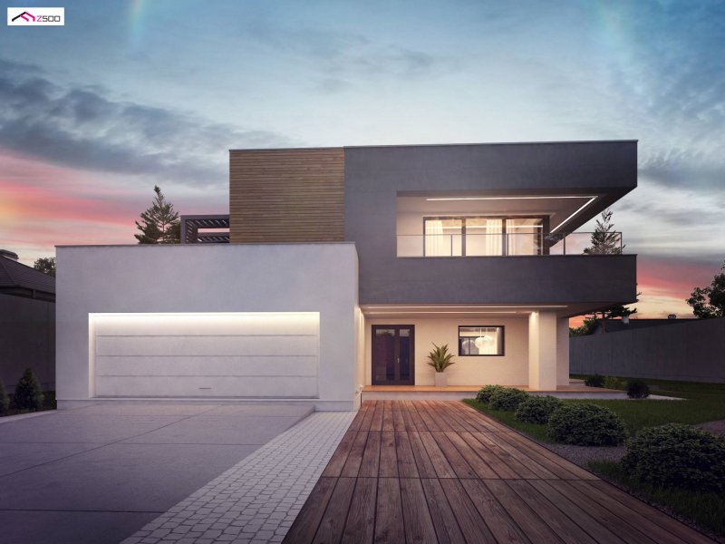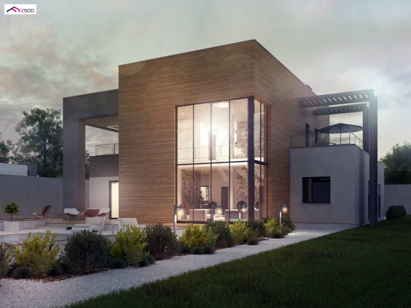 Zx108 to nowoczesny, dwukondygnacyjny dom z dużymi przeszkleniami, tarasami na piętrze oraz dużym garażem . Połączenie ciemnej elewacji z wykończeniem z egzotycznego drewna doskonale komponuje się z chłodną bielą tynku i zielenią ogrodu.