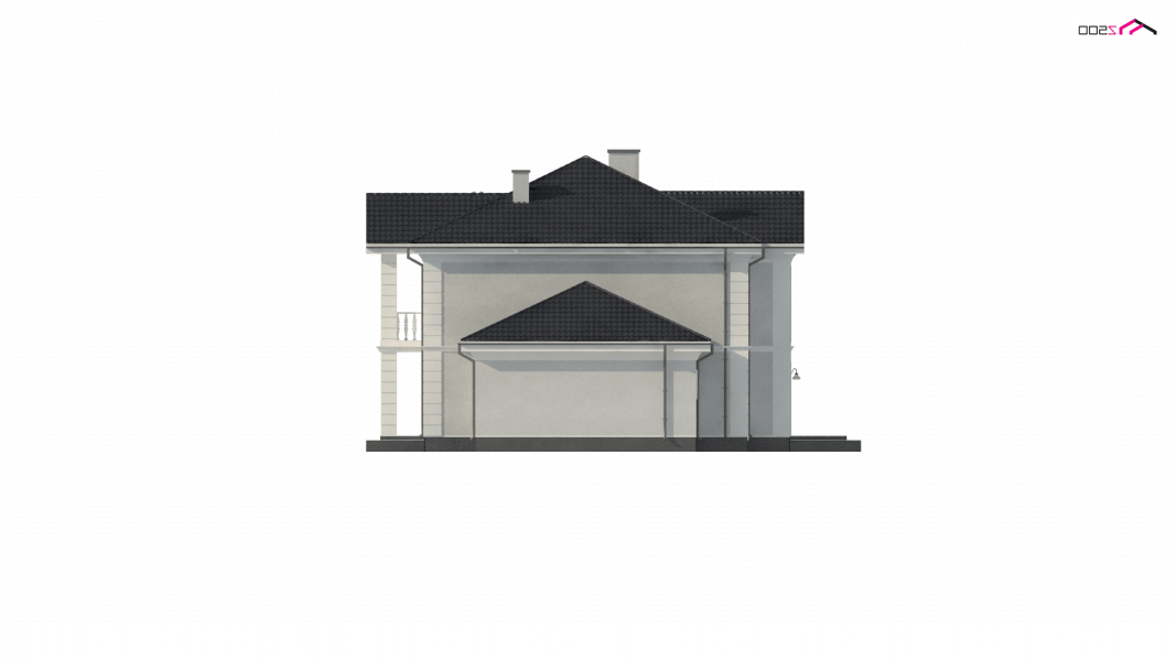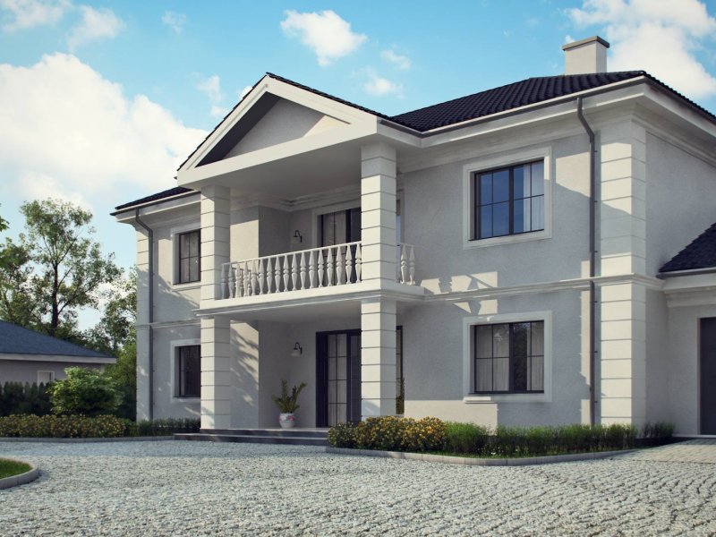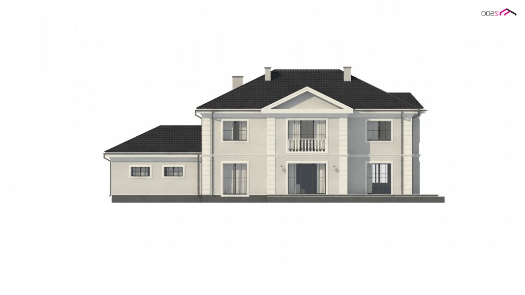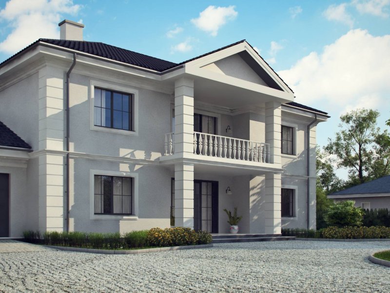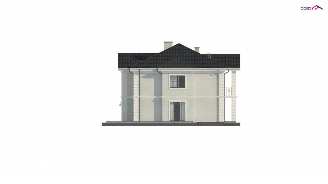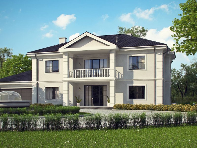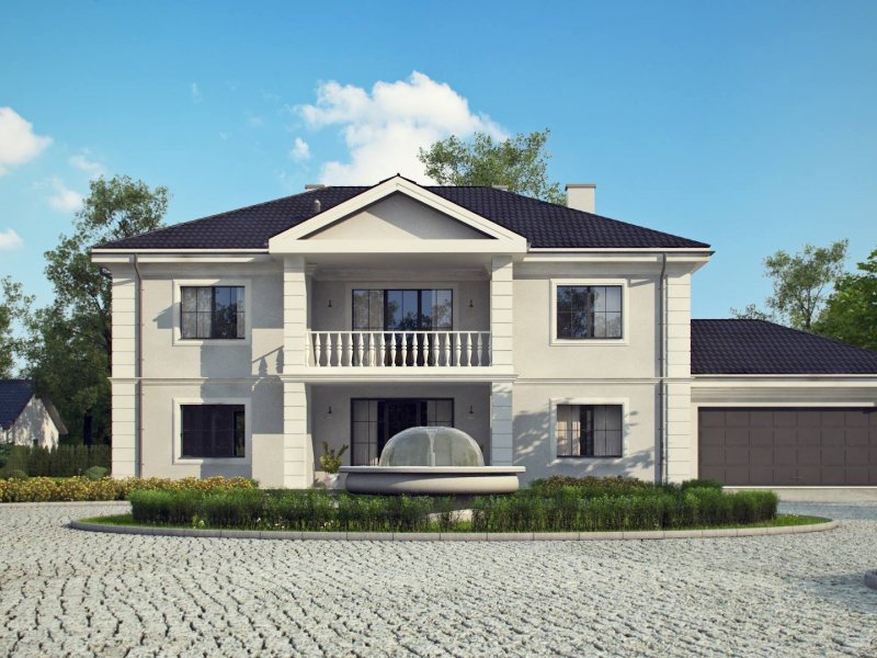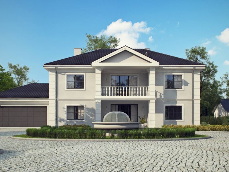 Elegancką, gustowną bryłę przykryto kopertowym dachem i wzbogacono o boniowania oraz o kolumny przy wejściu. Dzięki temu nabrała ona wykwintności i dobrego smaku.