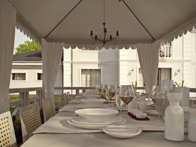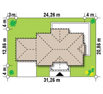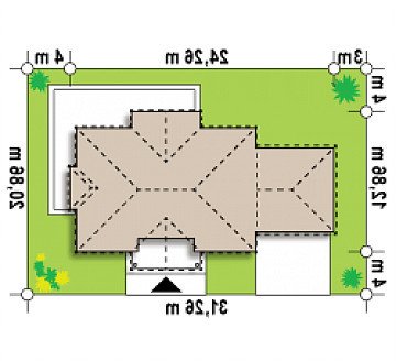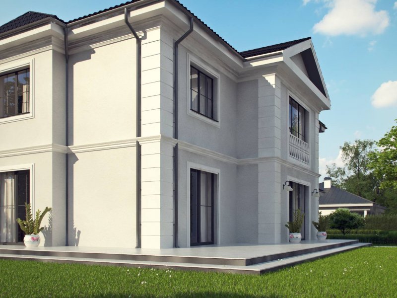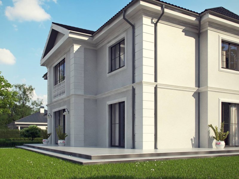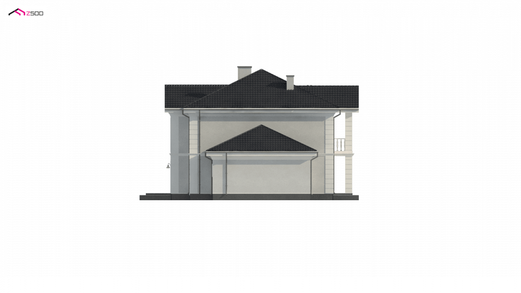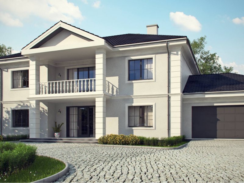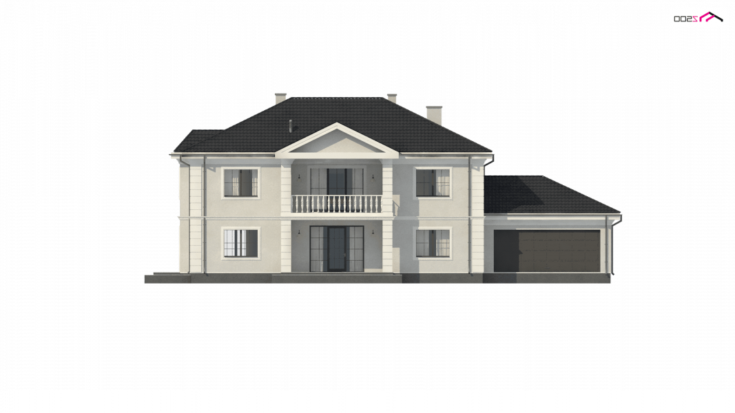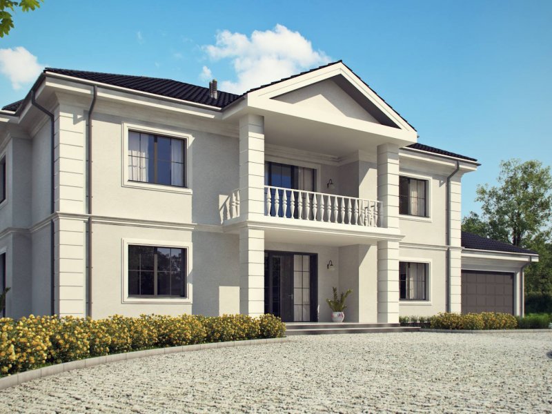 Elegancką, gustowną bryłę przykryto kopertowym dachem i wzbogacono o boniowania oraz o kolumny przy wejściu. Dzięki temu nabrała ona wykwintności i dobrego smaku.