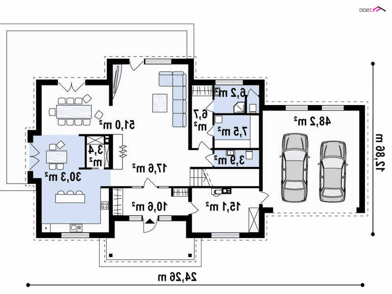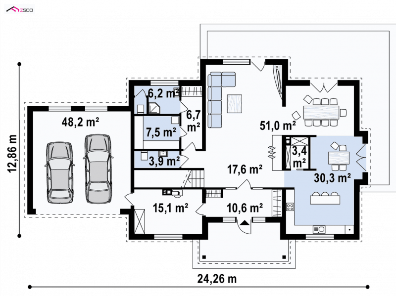 W lewym skrzydle budynku mieści się dwustanowiskowy garaż z bezpośrednim wejściem do domu. Stamtąd dzieli nas już jedynie kilka kroków od tego aby znaleźć się na piętrze.