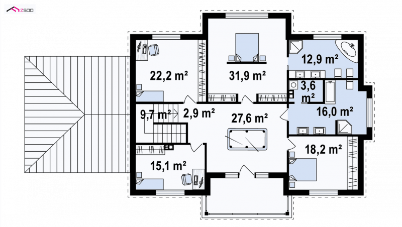 Piętro odkrywa przed nami również wiele możliwości. Projekt może być wykonany z tarasem nad garażem lub bez, a przestronny hol to wyborne miejsce na ustawienie stołu do gry w bilard lub ping ponga. Spośród czterech sypialni jedna posiada dodatkowo własną dużą łazienkę i miejsce na garderobę. Z racji na ich ustawność, pomieszczą dużą ilość kosmetyków i ubrań.
