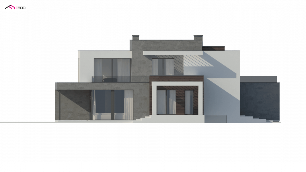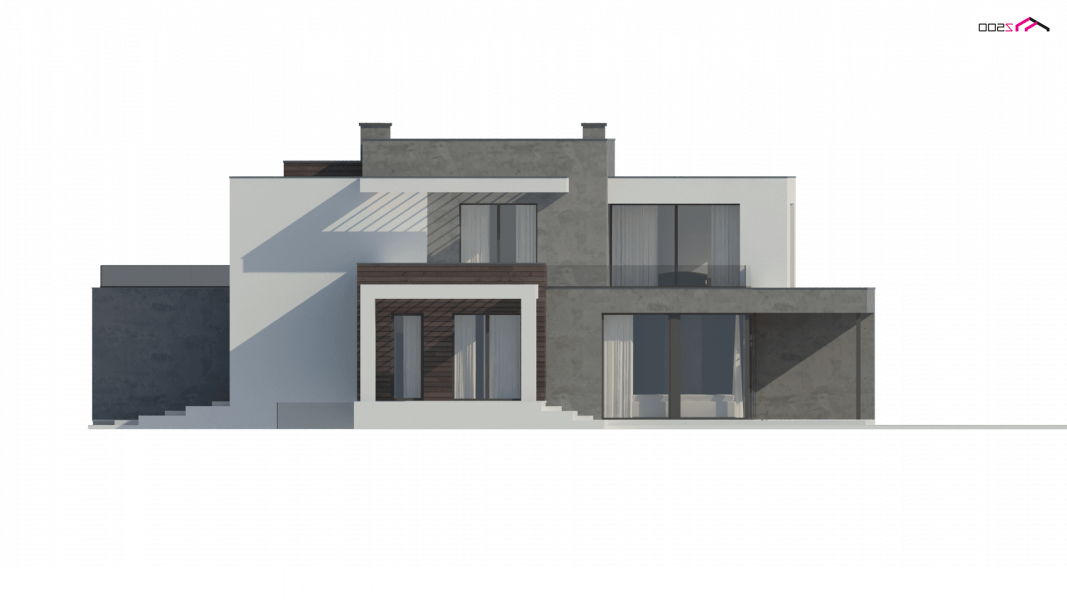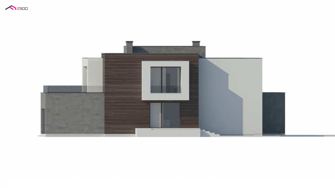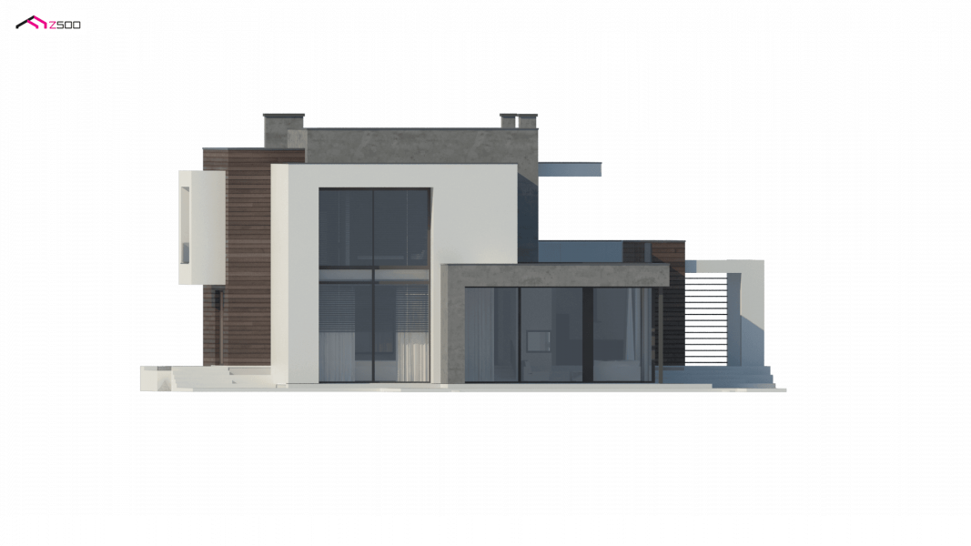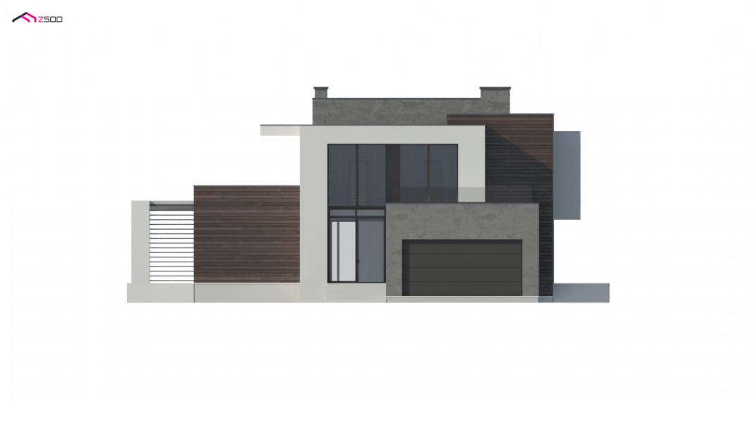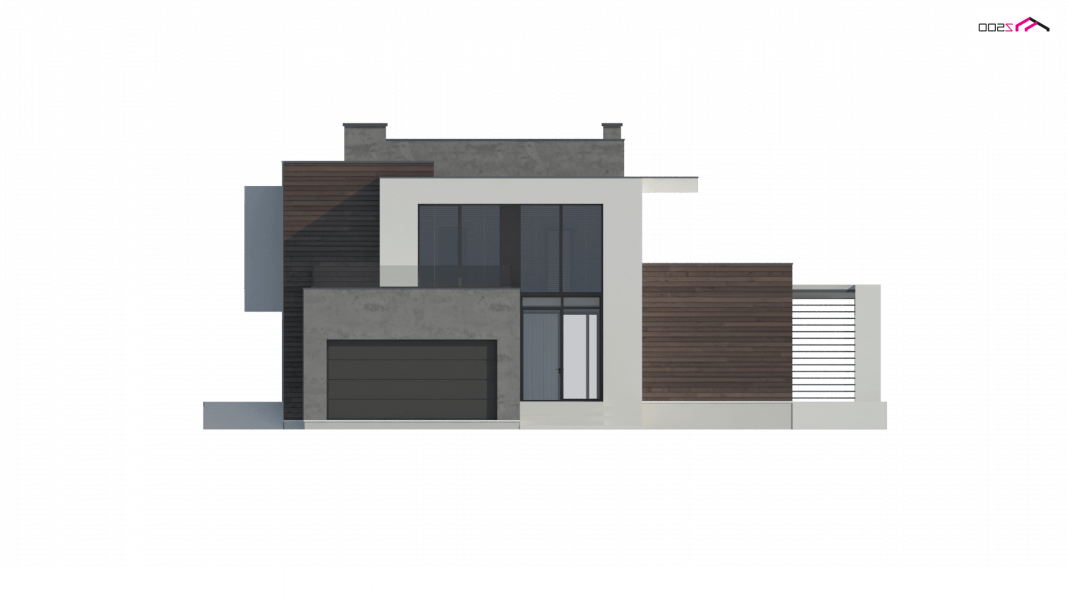 Nowoczesna willa z płaskim dachem i dwustanowiskowym garażem o powierzchni niespełna 300 m2. Elewację zaproponowano w stonowanej kolorystyce. Dominują biel, drewno i szarość wykonana z betonu lub tynku. Zadaszone wejście oraz ściana wejściowa przeszklona na wysokości obydwu pięter zostały podkreślone rozłożystym przeszkleniem.
