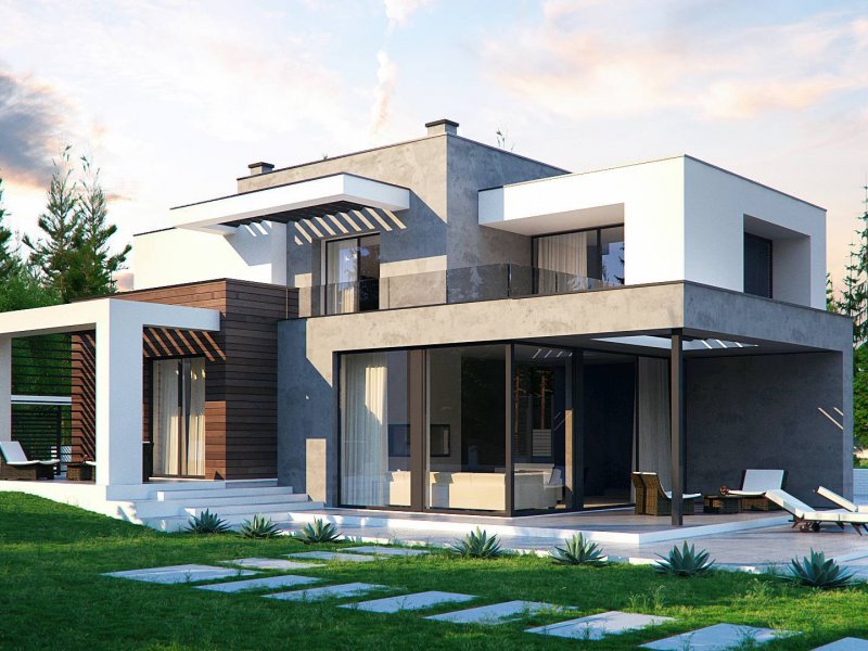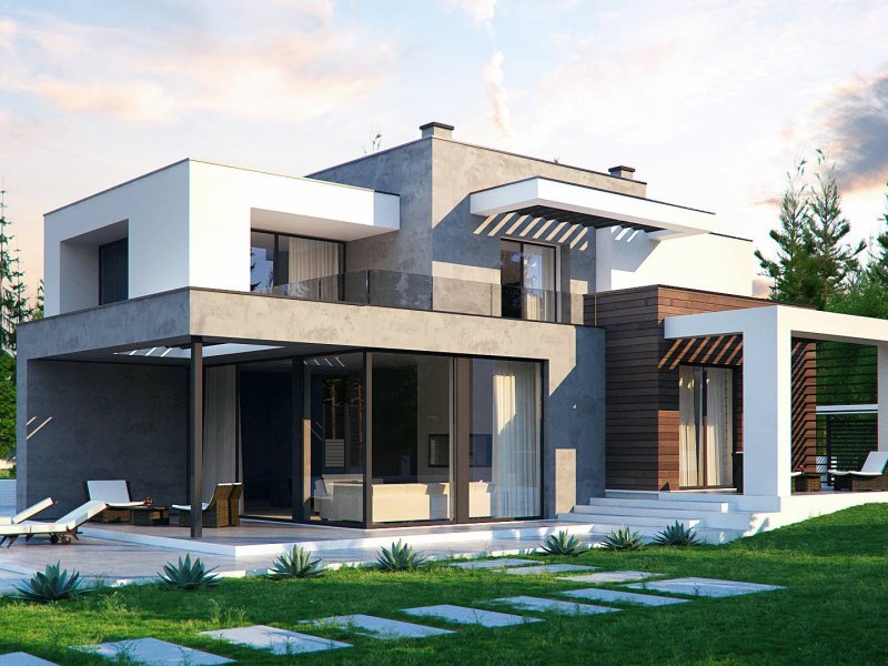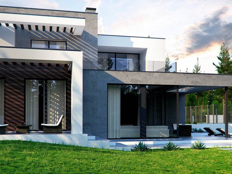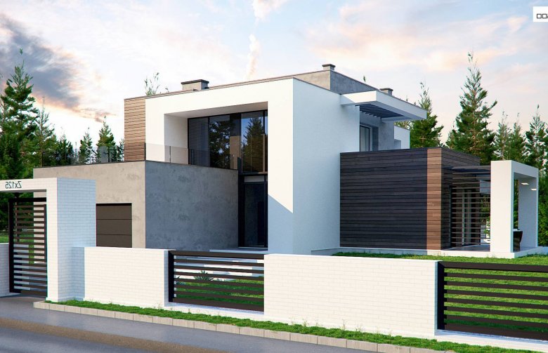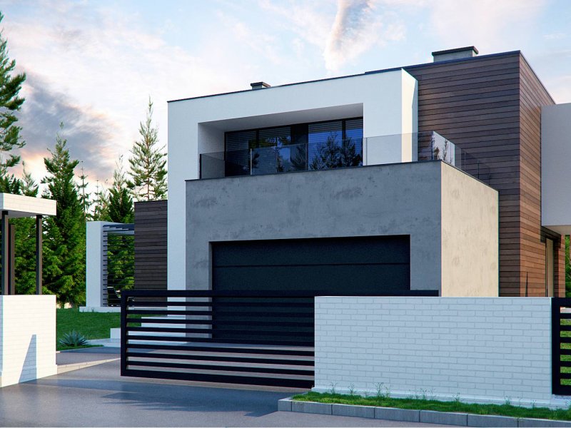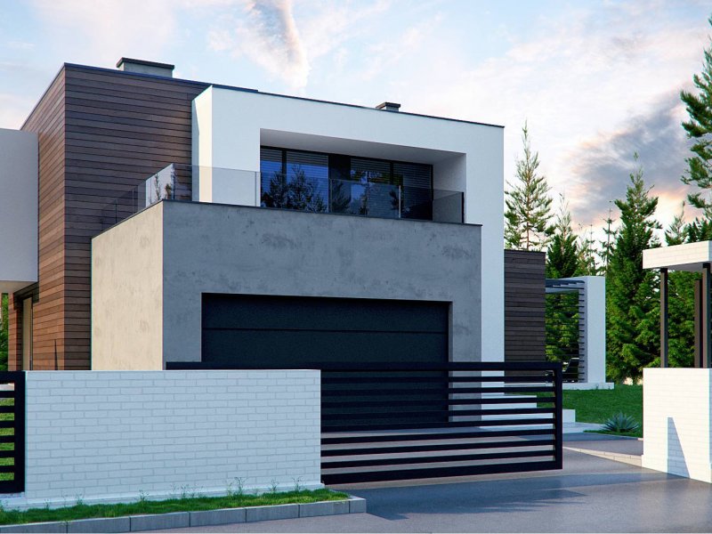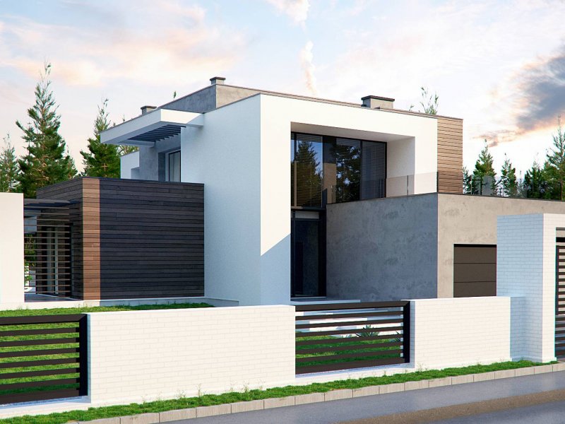 Nowoczesna willa z płaskim dachem i dwustanowiskowym garażem o powierzchni niespełna 300 m2. Elewację zaproponowano w stonowanej kolorystyce. Dominują biel, drewno i szarość wykonana z betonu lub tynku. Zadaszone wejście oraz ściana wejściowa przeszklona na wysokości obydwu pięter zostały podkreślone rozłożystym przeszkleniem.