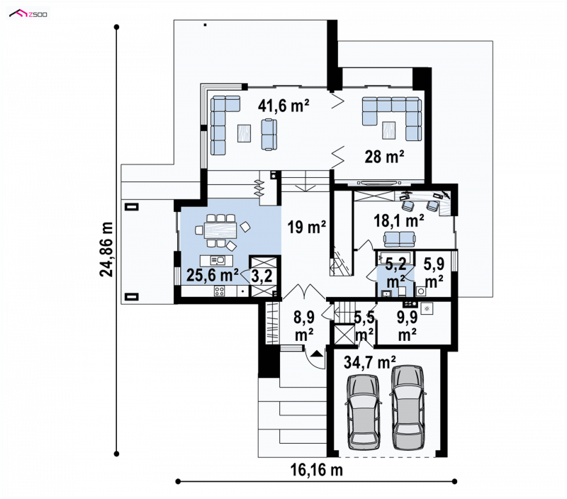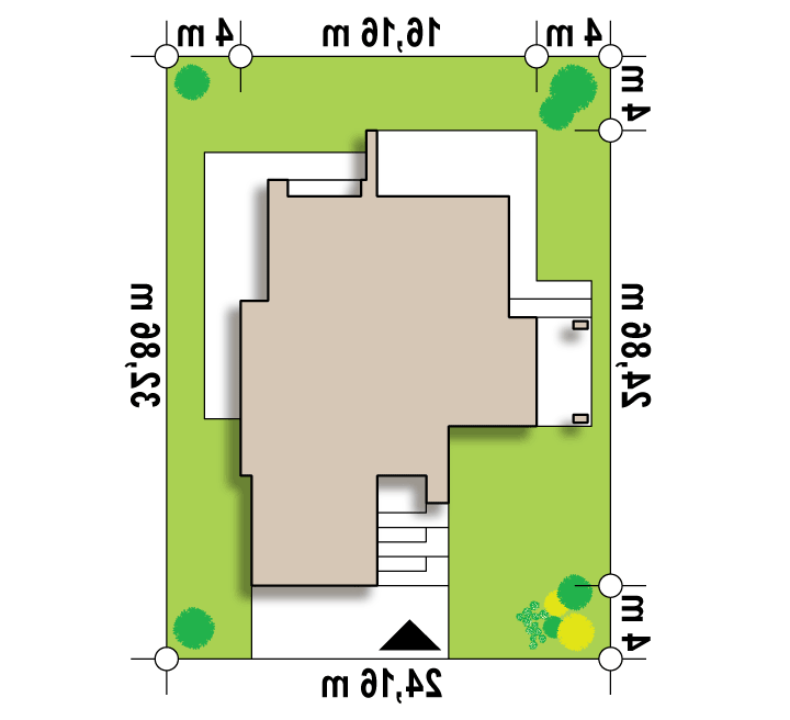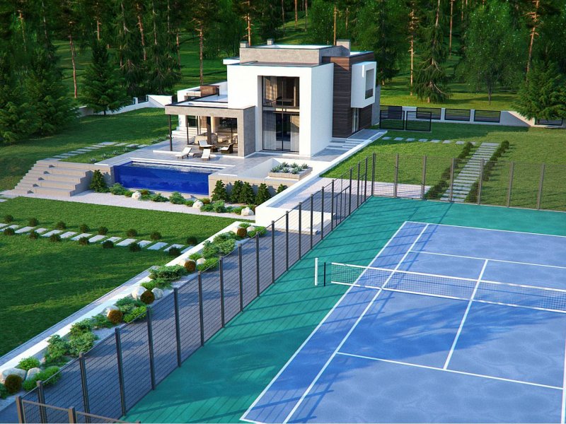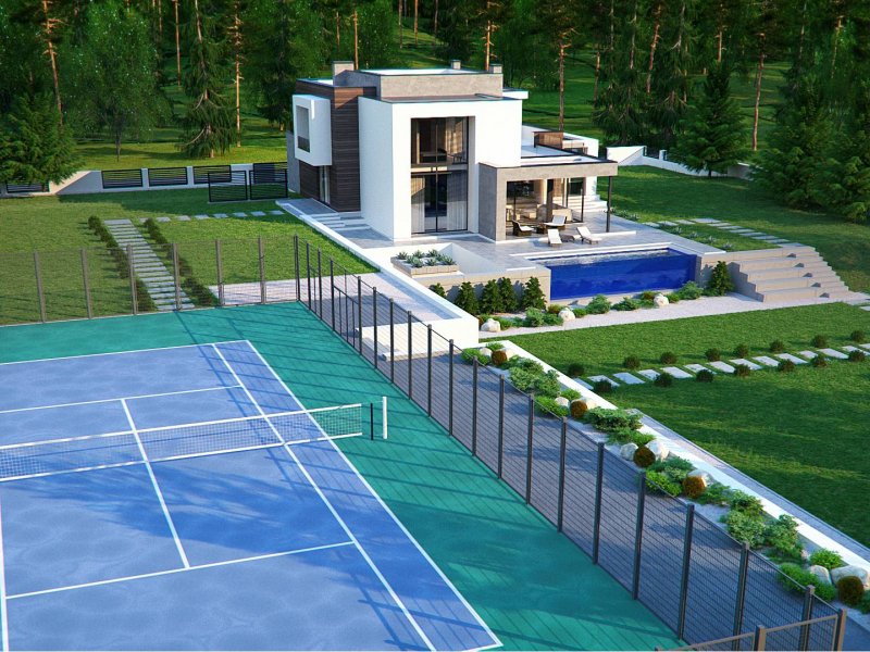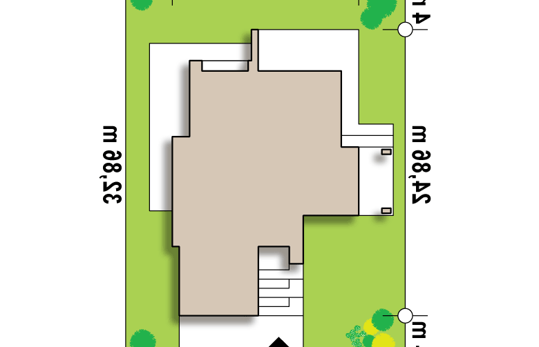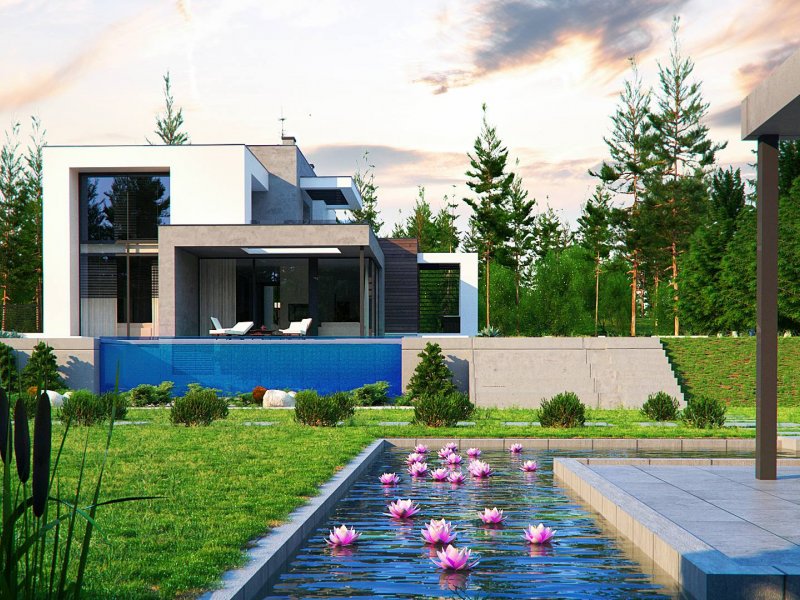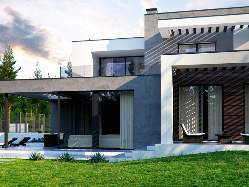 Wejście do domu umiejscowiono na podwyższeniu. Użyto również masywnego zadaszenia, które podkreśla surowy styl nowoczesnej architektury. Bryłę stworzono z przenikających się sześcianów o różnej wysokości, teksturze i kolorystyce.
