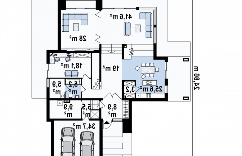 Na pierwszym planie po wejściu do domu wita nas ergonomiczna część gospodarcza: sień z miejscem na dużą szafę wnękową. Pomieszczenie gospodarcze z piecem na paliwo stałe oraz hol będący ogniwem łączącym garaż z resztą domu znajduje się poniżej wejścia do budynku.