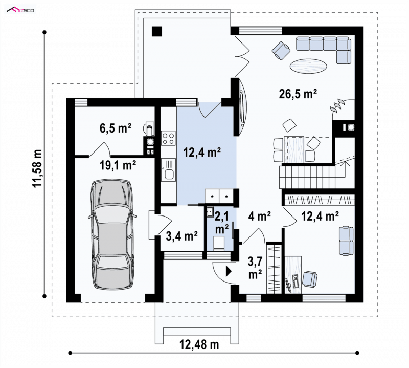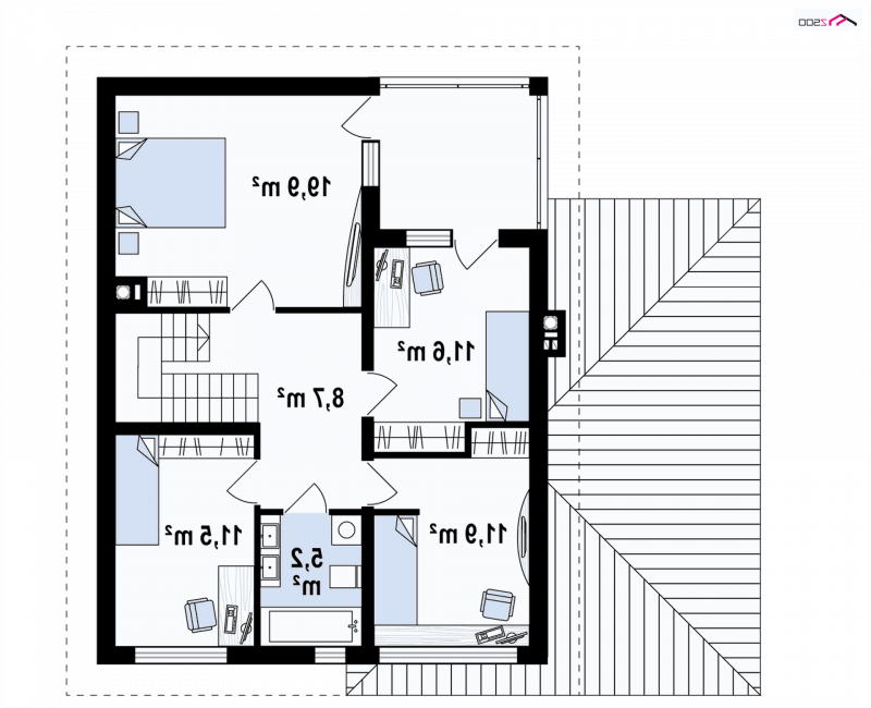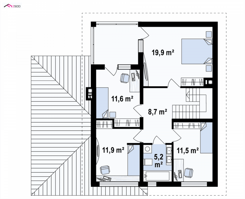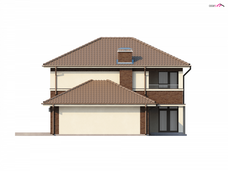 Prosty układ funkcjonalny sprawia, że będzie się w nim mieszkać komfortowo i wygodnie latami. Dom podzielony jest na strefy: dzienną znajdującą się na parterze i nocną która jest na piętrze. W strefie dziennej znalazł miejsce duży i jasny gabinet i atrakcyjnie położona, półotwarta i komfortowa kuchnia połączona z salonem. Część sypialna domu została zaprojektowana na piętrze, największy pokój dla rodziców plus mniejsze dla dzieci. Dodatkowo z sypialni rodziców przewidziano także wyjście na spory zadaszony balkon.