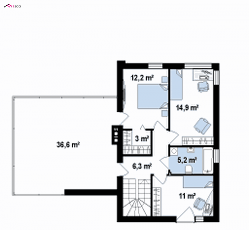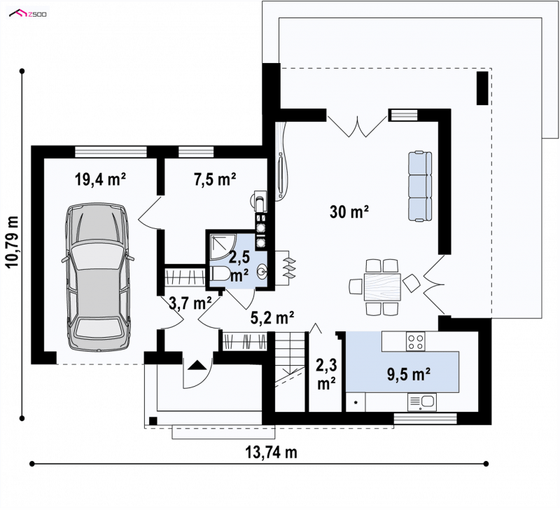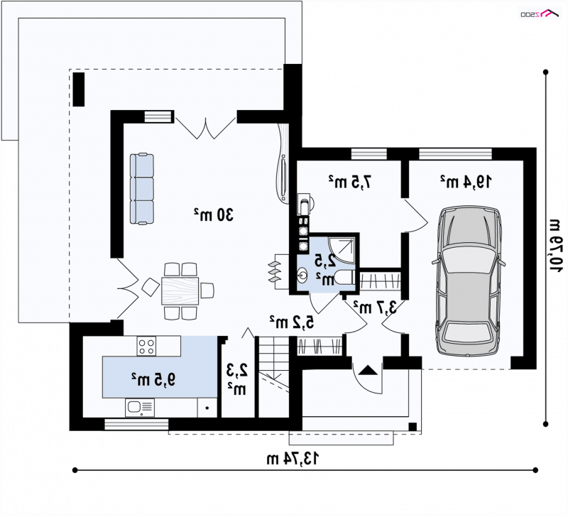Zx41v1 to piętrowy dom z płaskim dachem z garażem w bryle. Elegancka, modernistyczna bryła we wnętrzu wyraźnie została podzielono na strefę dzienną i nocną.