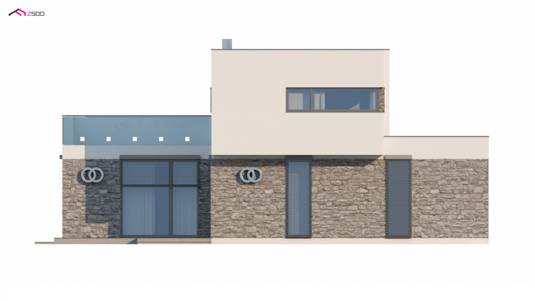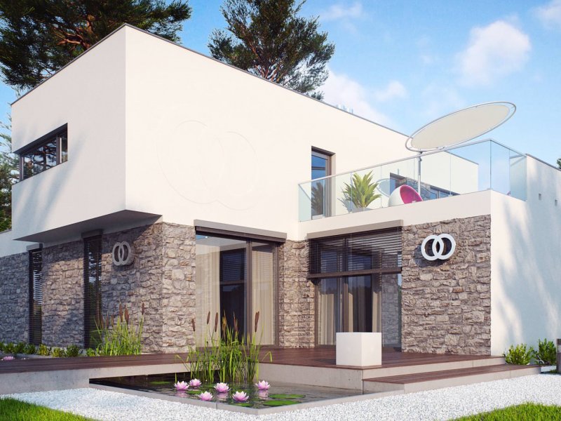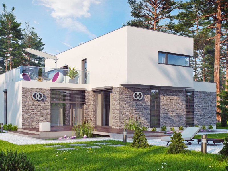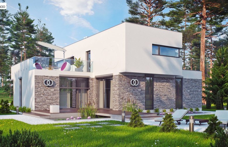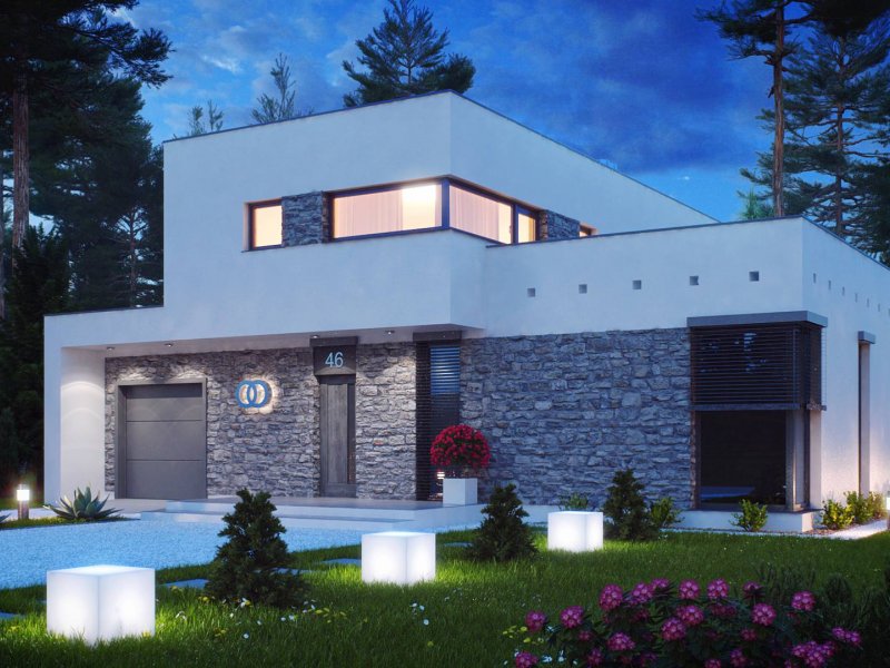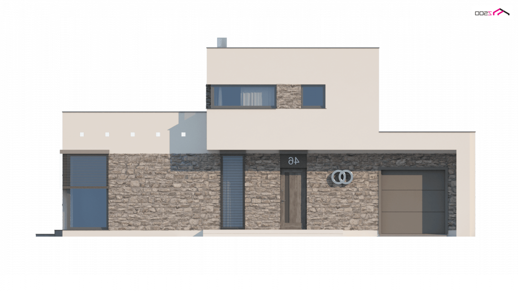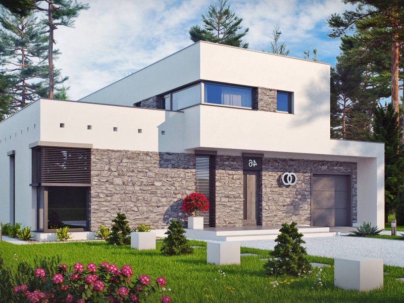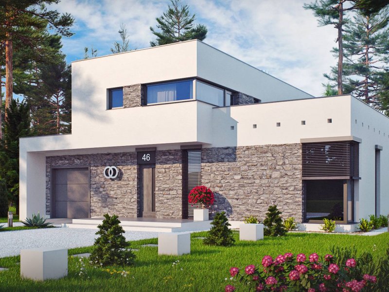 Projekt nowoczesnego domu Zx46 wyróżnia się ciekawą, kubiczną bryłą oraz detalami z jasnego kamienia.