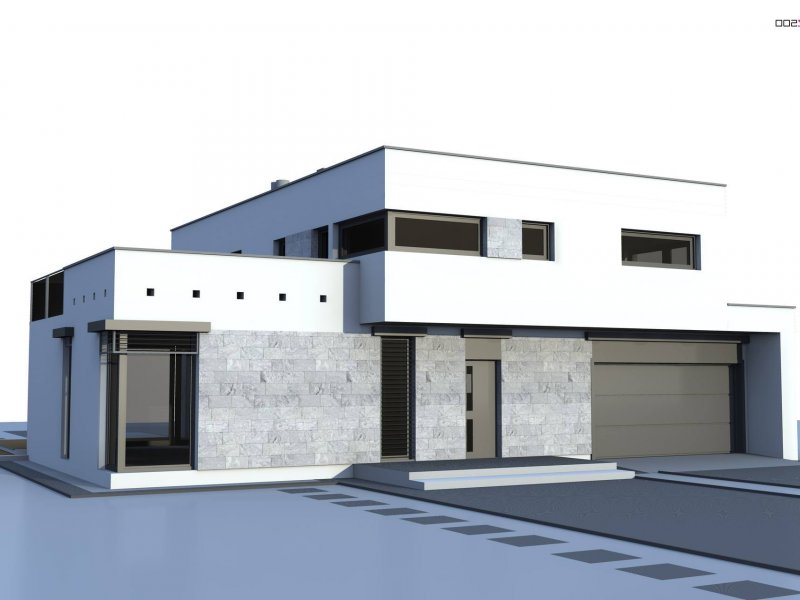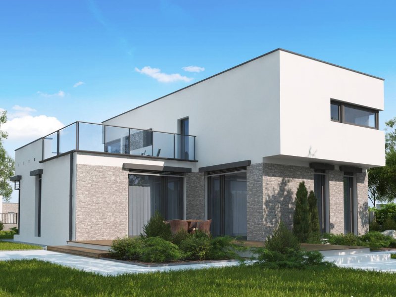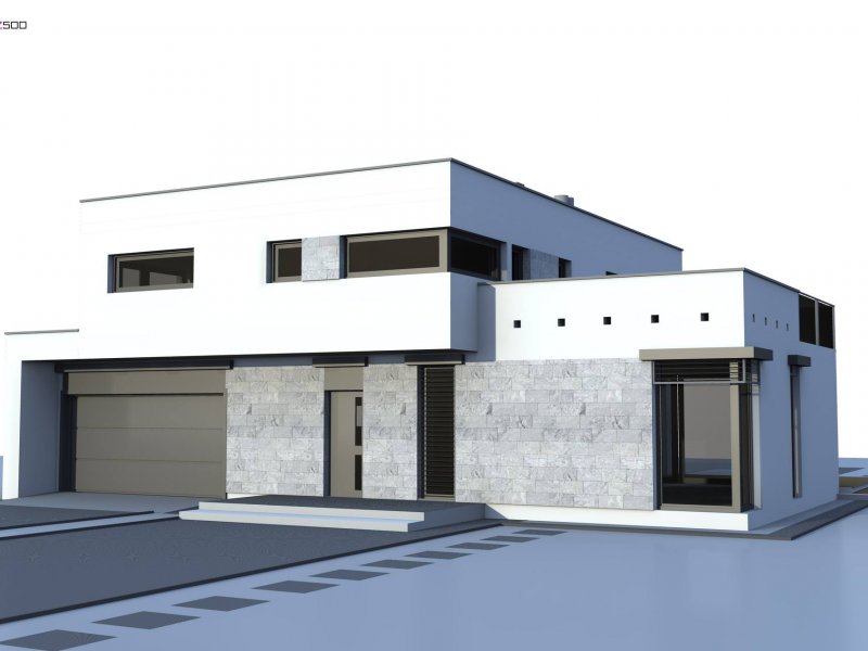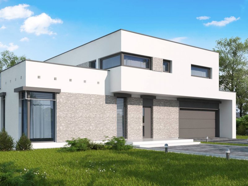 Projekt domu nowoczesnego Zx46 GL2 wyróżnia się nowoczesną, kubiczną bryłą oraz detalami z jasnego kamienia.