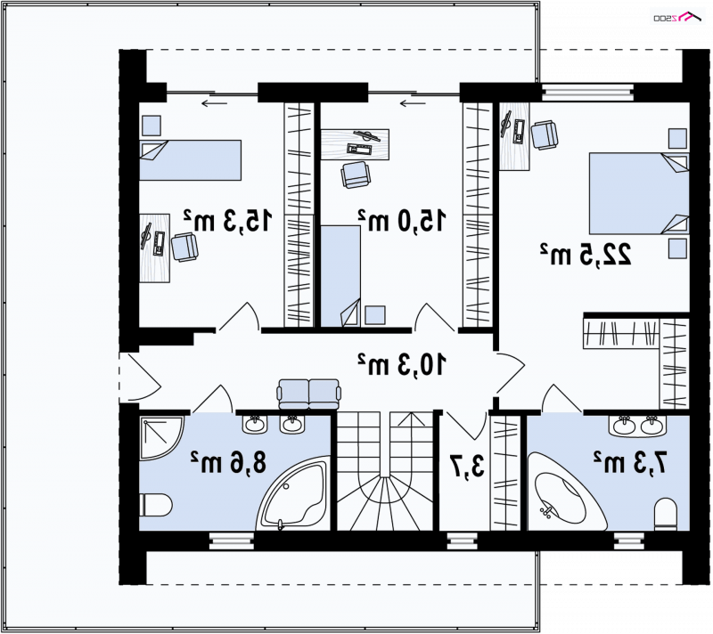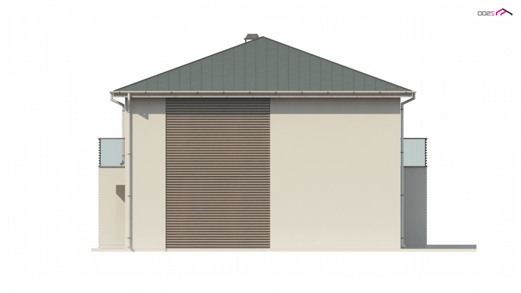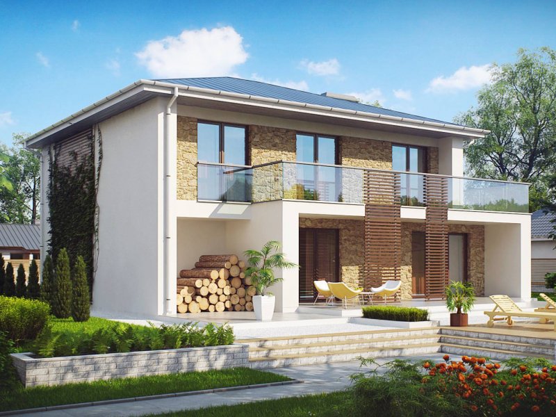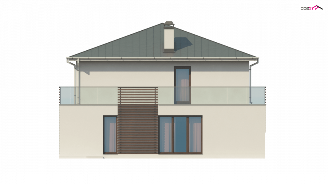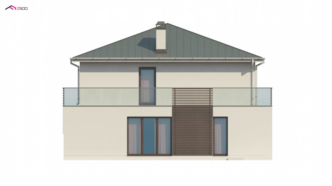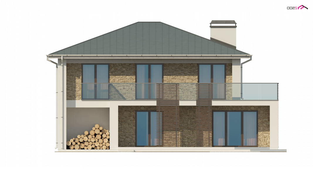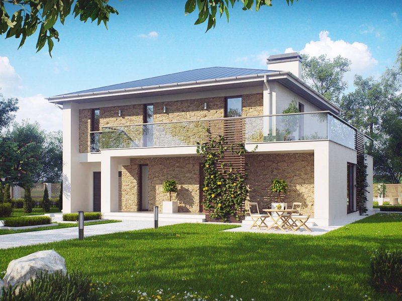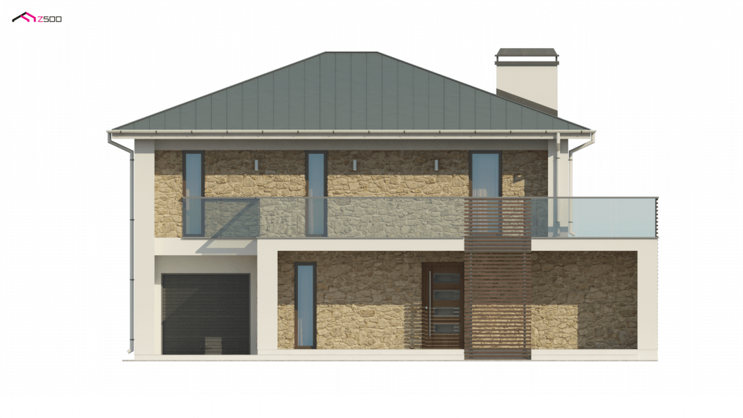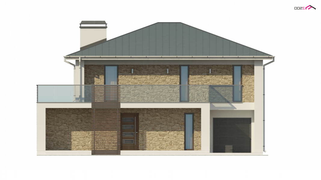 Zx55 to nowoczesny i funkcjonalny dom o eleganckiej formie architektonicznej i efektownie ukształtowanej przestrzeni wewnętrznej. Cechą wyróżniającą projekt jest obszerny taras na piętrze, który stanowi jednocześnie zadaszenie wejścia oraz tarasu na parterze.Połączenie bieli oraz kamienia na elewacjach tworzy spójną całość o wysokiej estetyce.