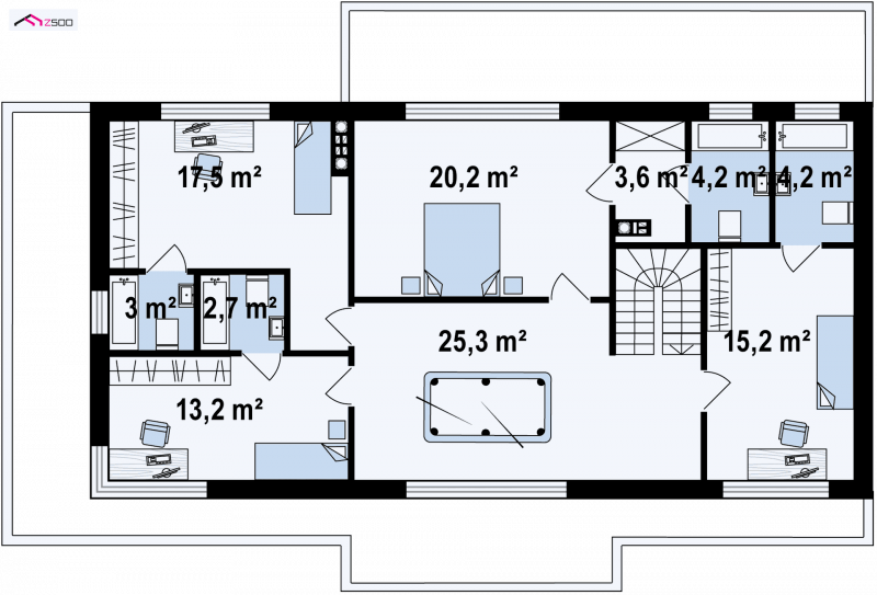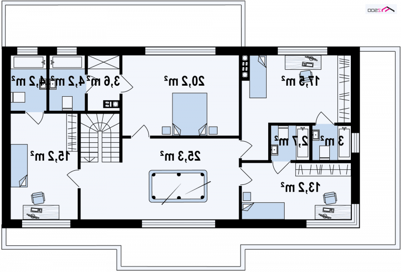 Na piętrze każdy pokój posiada własną łazienkę. Największy pokój zawiera także garderobę. Do większości pokoi można doprojektować drzwi balkonowe zamiast okien, wtedy można uzyskać wyjścia na balkon. Na środku piętra znajduje się duży hol, który może tworzyć część rekreacyjną np. na bilard.