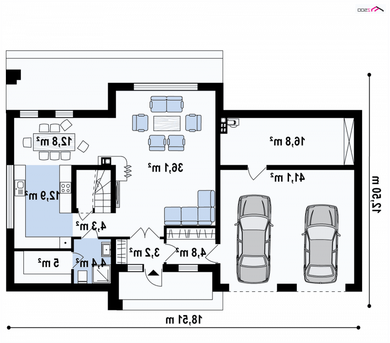 Zx61 jest domem nowoczesnym z tradycyjnym materiałem elewacyjnym - cegłą klinkierową. Na parterze została zaprojektowana duża część dzienna, składająca się z obszernego salonu z widokiem na ogród, połączonym z jadalnią i kuchnią. Na tej kondygnacji znajduje się również łazienka z sauną. Do domu można wejść również przez garaż. Pomieszczenie gospodarcze zostało przystosowane także na możliwość ogrzewania domu paliwem stałym.