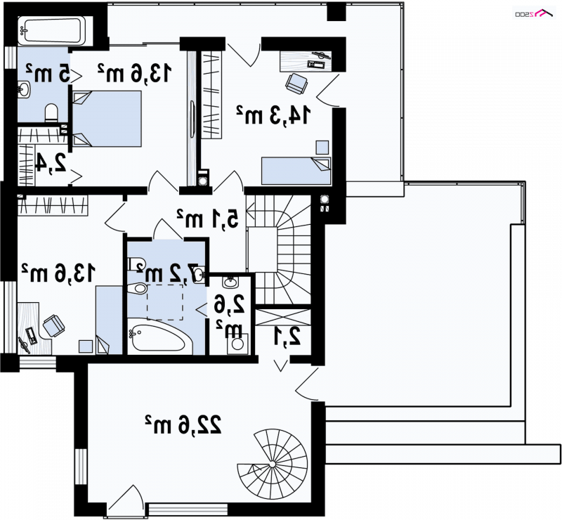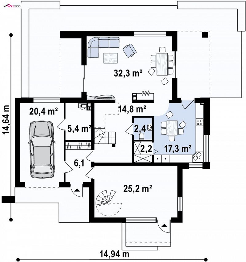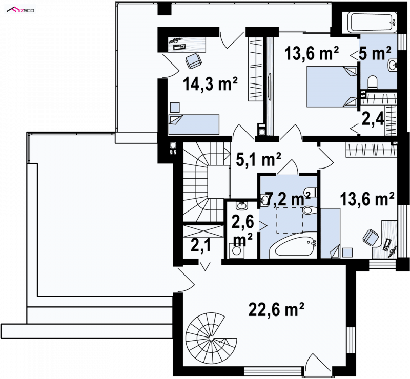 Zx64 to przestronny dom dla poszukujących nowoczesnych rozwiązań. Na parterze znajduje się obszerna strefa dzienna. Jej główne zalety to duża kuchnia z jadalnią i spiżarką. Idealnie doświetlony salon posiada duże przeszklenia oraz dwa zadaszone tarasy, które pozwolą cieszyć się otaczającą przyrodą. Wygodne schody prowadzą na piętro, gdzie zaprojektowano trzy podobnej wielkości sypialnie. Sypialnia rodziców to niemal prywatny apartament z własną garderobą, łazienką oraz wyjściem na taras.